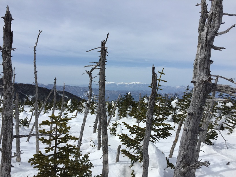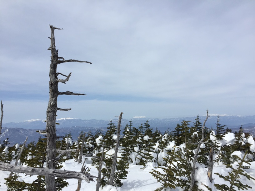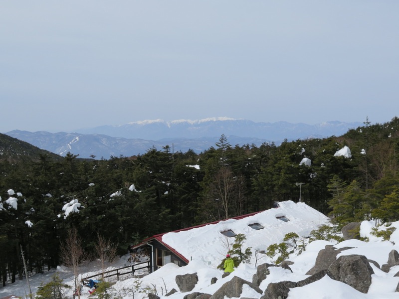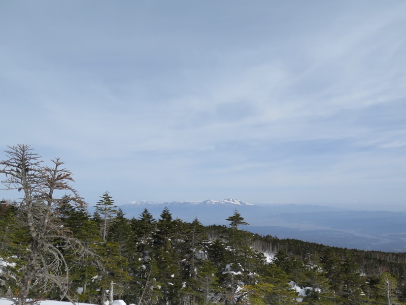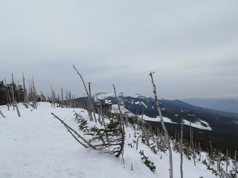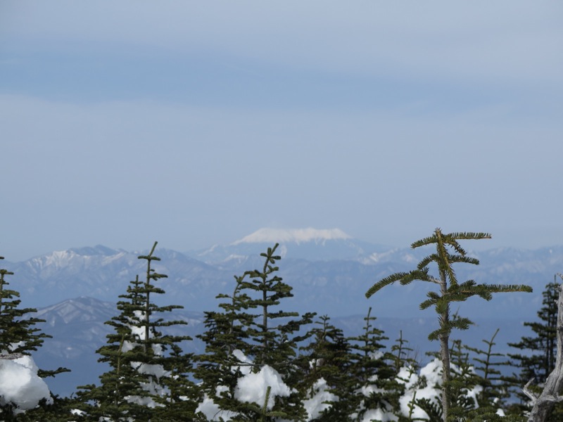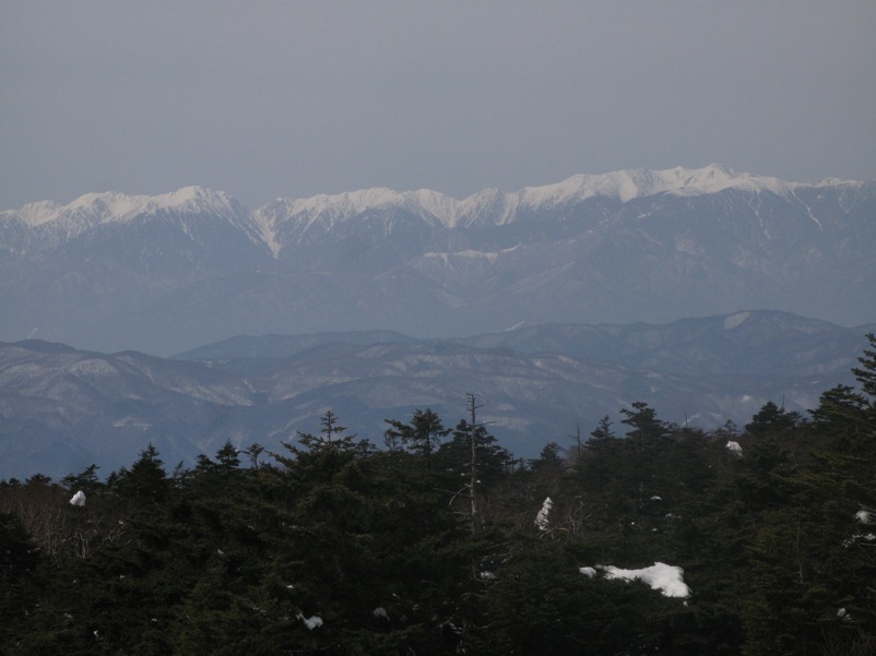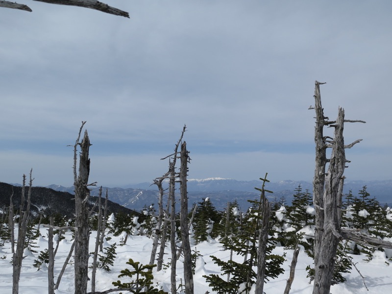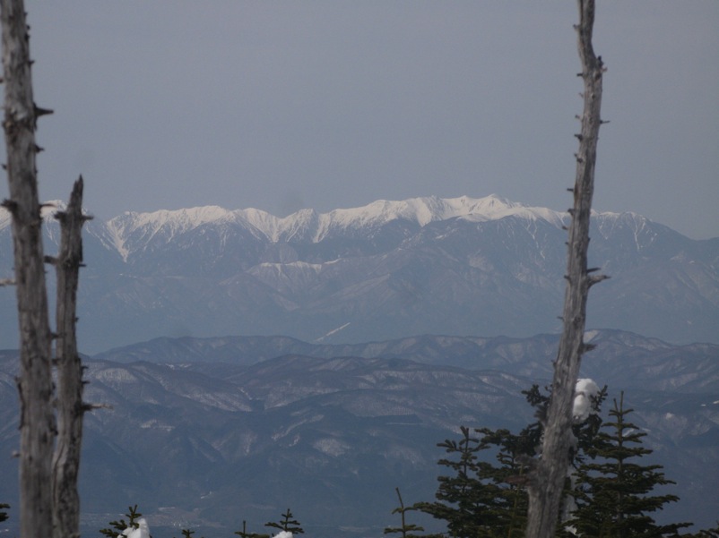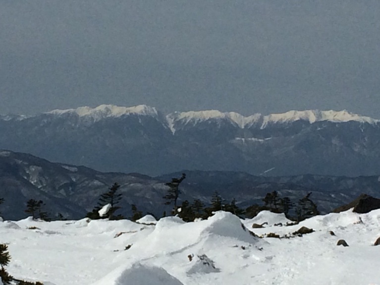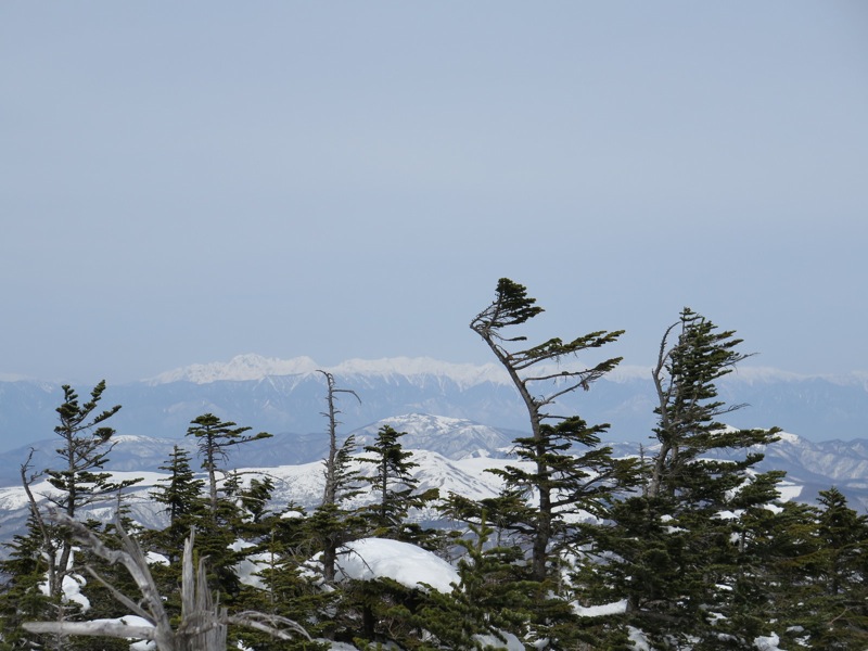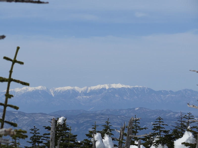 ここはだいたい風の強いところで、真冬なら周囲の樹木には霧氷によるエビのしっぽが立派に育っているはずです。そういう意味ではかなり緩んだ雪景色。画面右端に南アルプスが見えています。