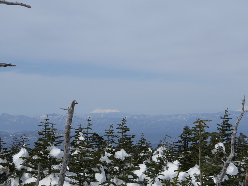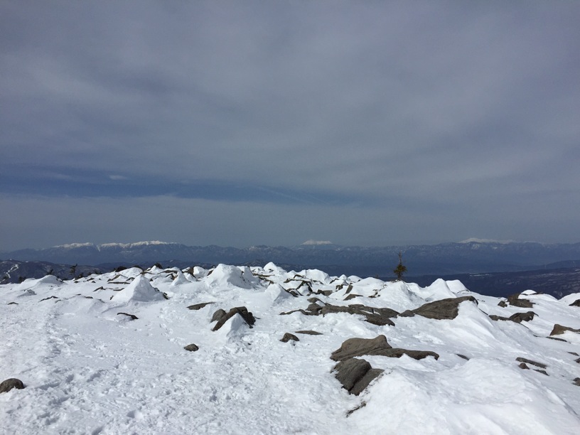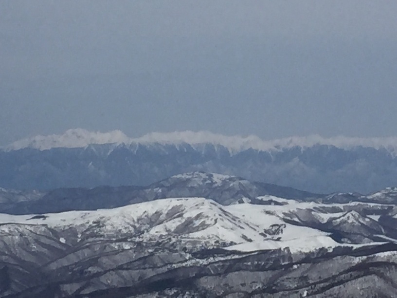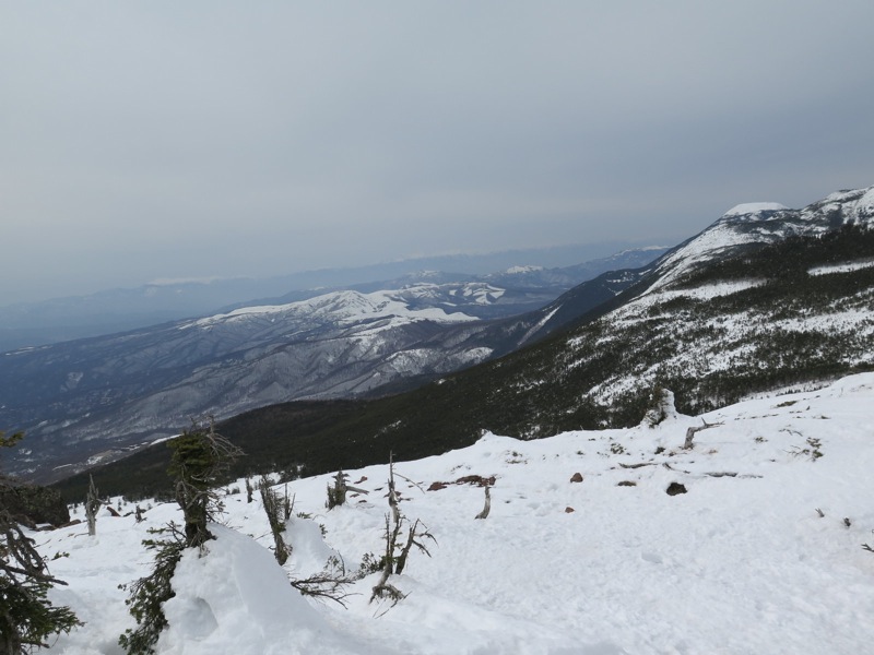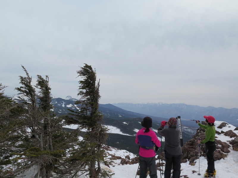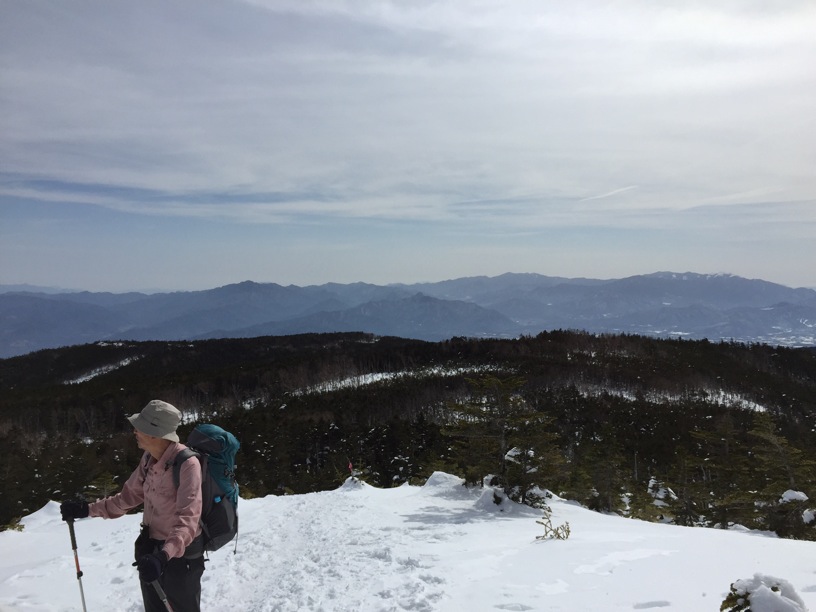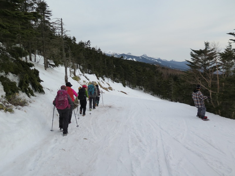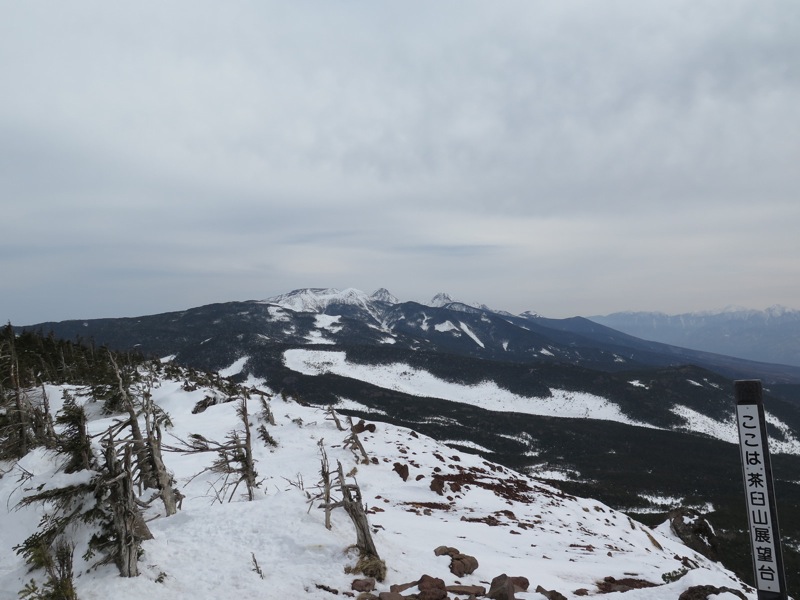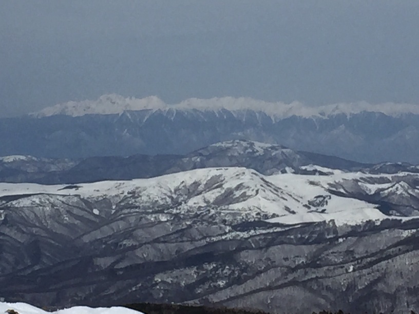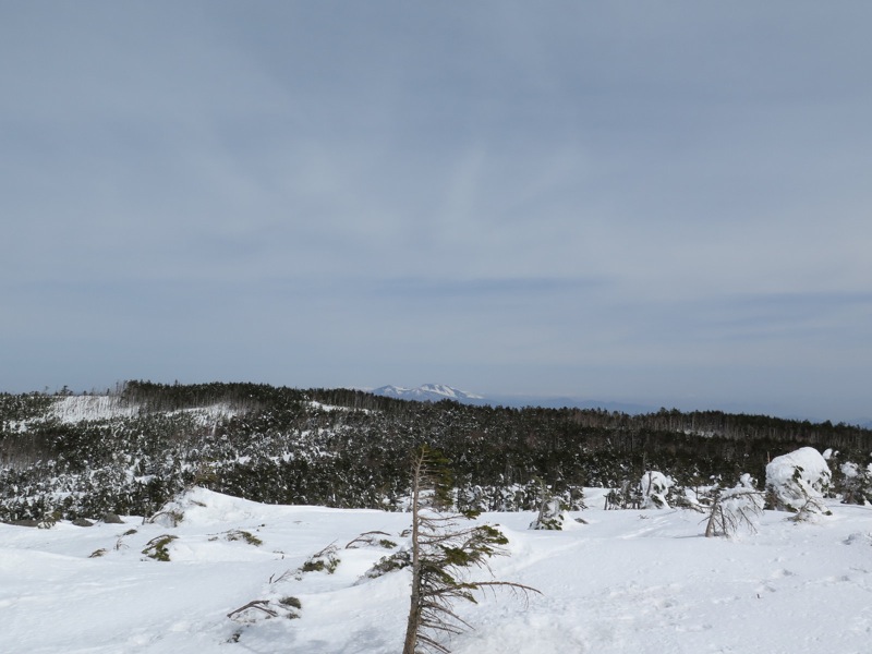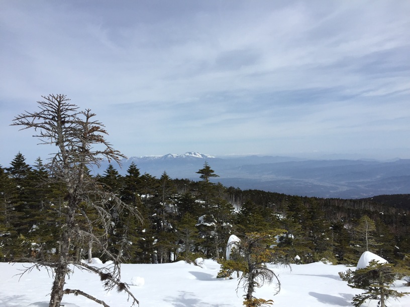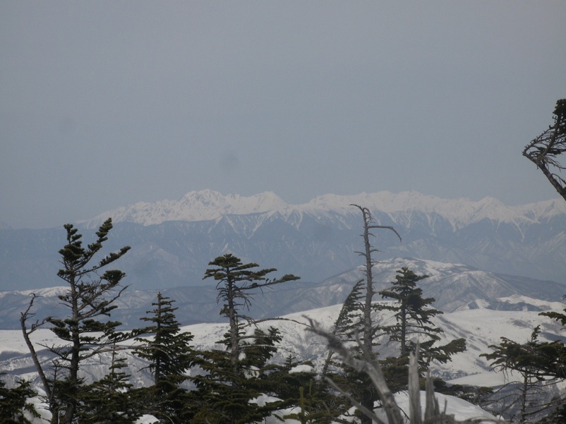 ここはだいたい風の強いところで、真冬なら周囲の樹木には霧氷によるエビのしっぽが立派に育っているはずです。そういう意味ではかなり緩んだ雪景色。画面右端に南アルプスが見えています。