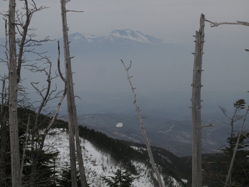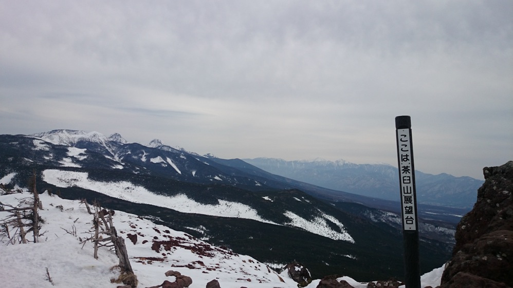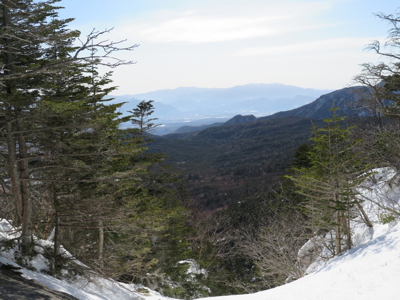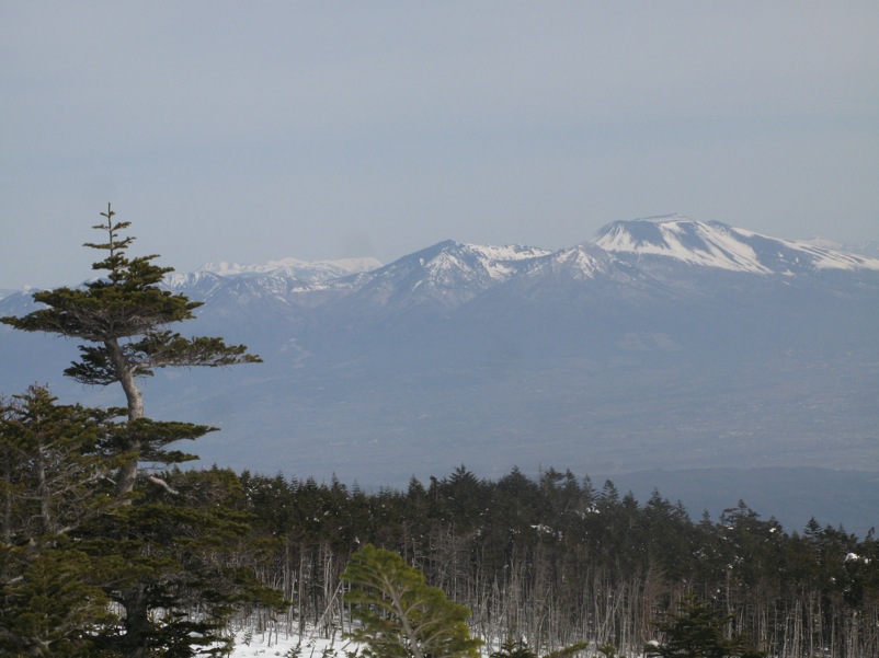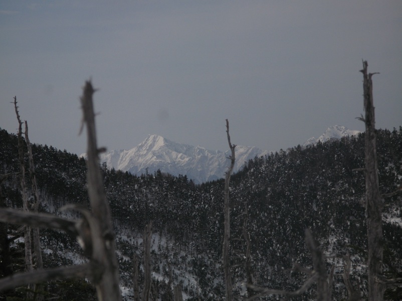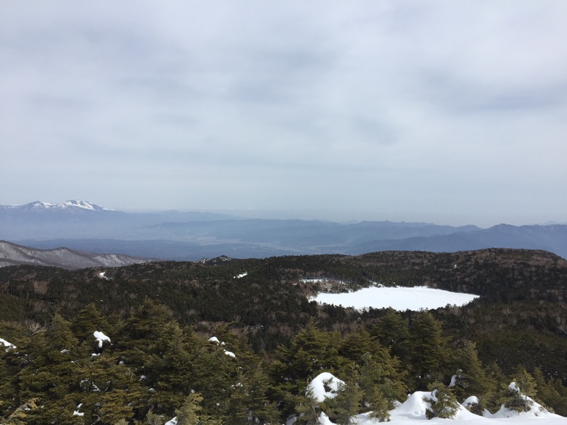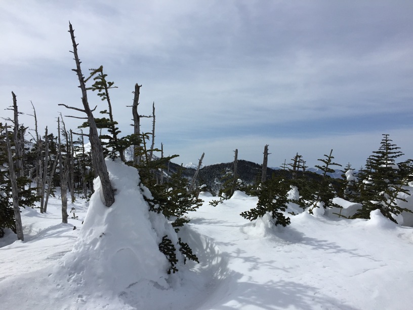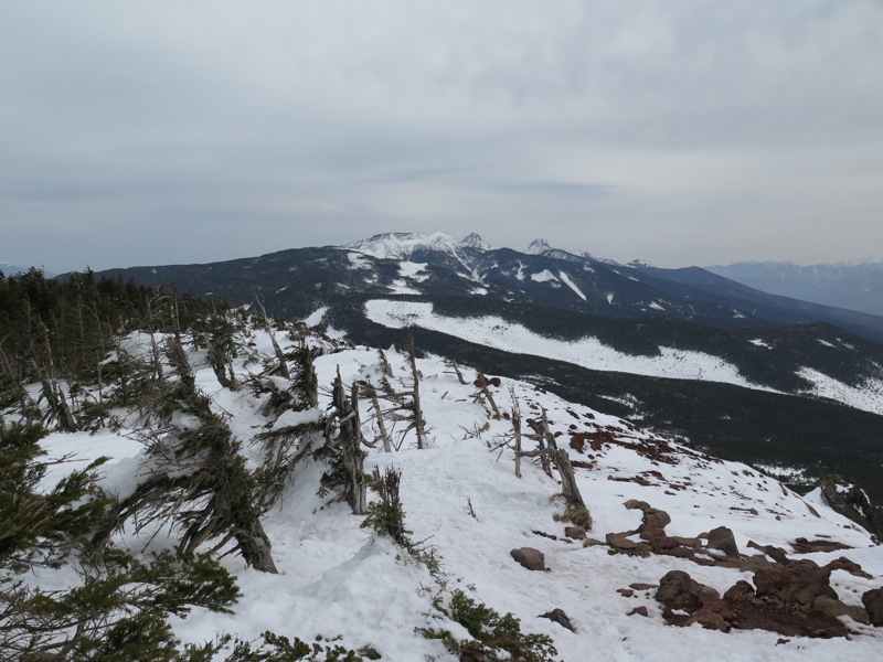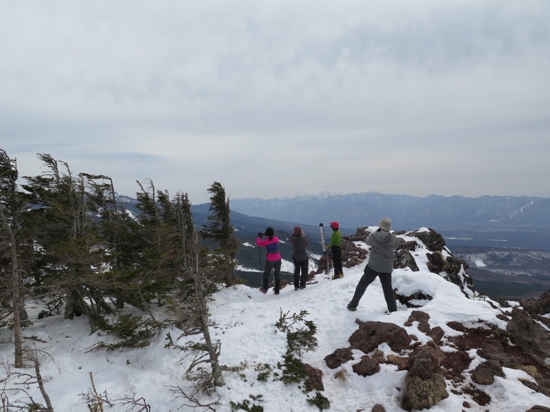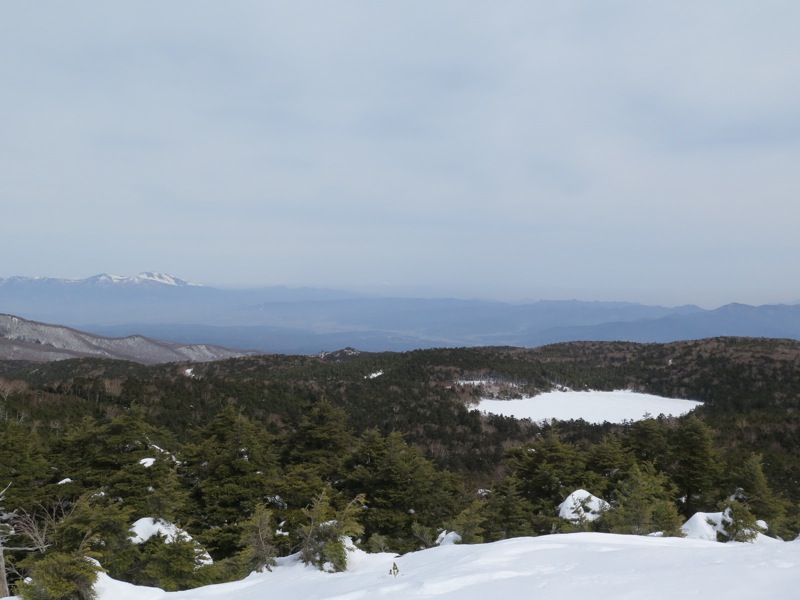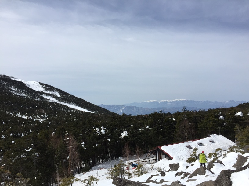 ここはだいたい風の強いところで、真冬なら周囲の樹木には霧氷によるエビのしっぽが立派に育っているはずです。そういう意味ではかなり緩んだ雪景色。画面右端に南アルプスが見えています。