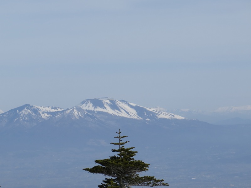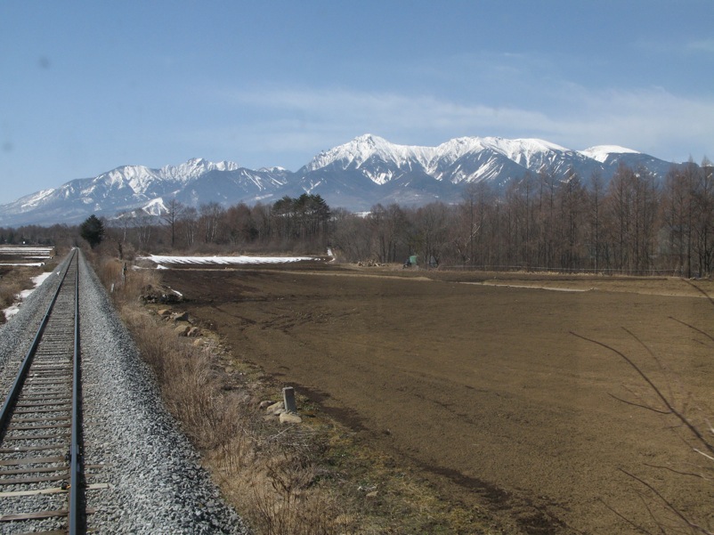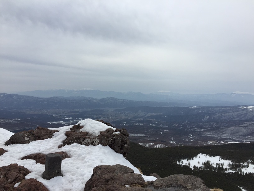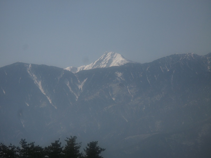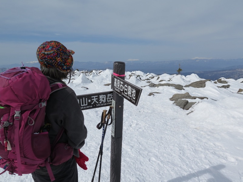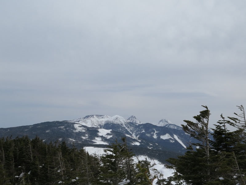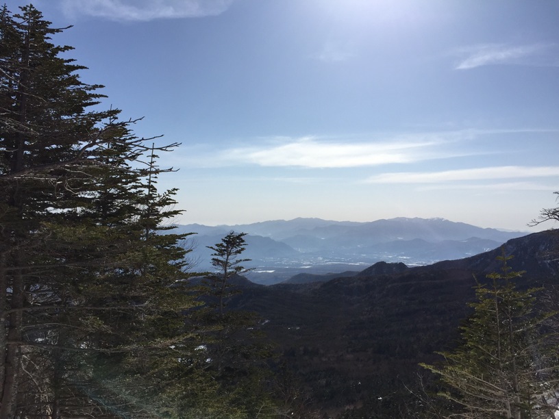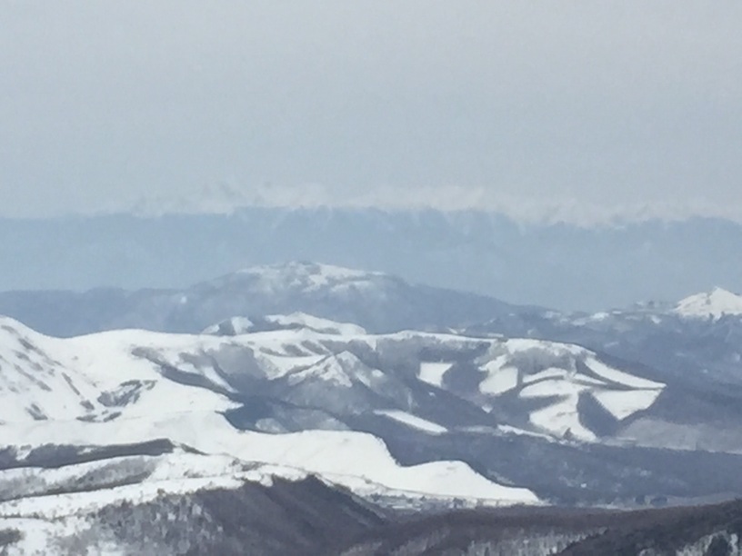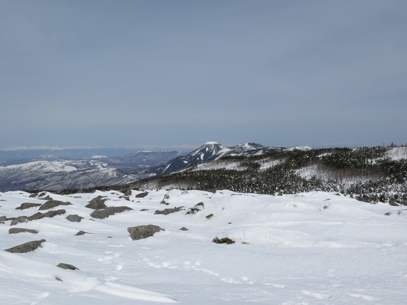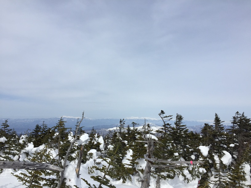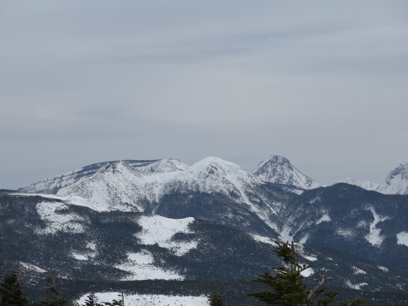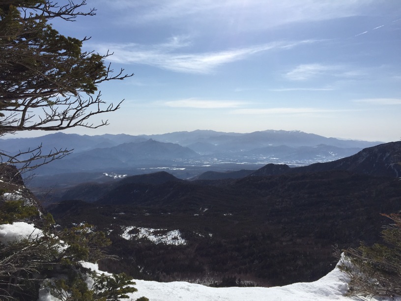 ここはだいたい風の強いところで、真冬なら周囲の樹木には霧氷によるエビのしっぽが立派に育っているはずです。そういう意味ではかなり緩んだ雪景色。画面右端に南アルプスが見えています。