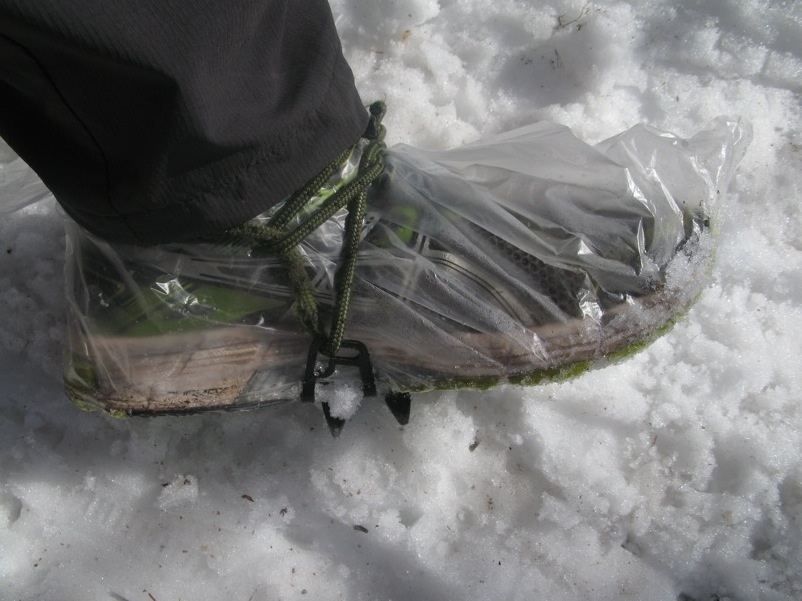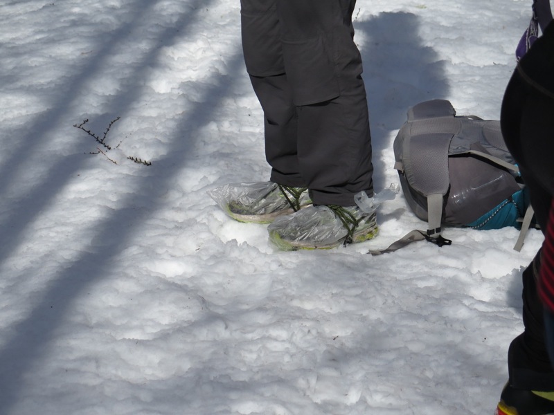 そのとき私たちに追いついた女性グループはアイゼンをはきましたが。前爪のついた10本爪、12本爪の本格的なアイゼンでした。翻って、今回しらびそ小屋で同宿だった佐久のみなさんも10本爪、12本爪のアイゼンでした。