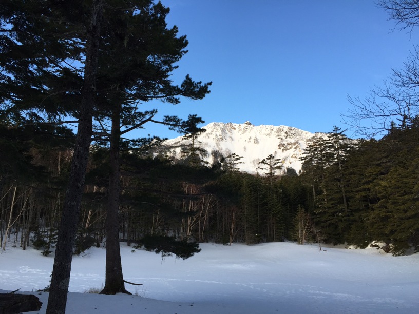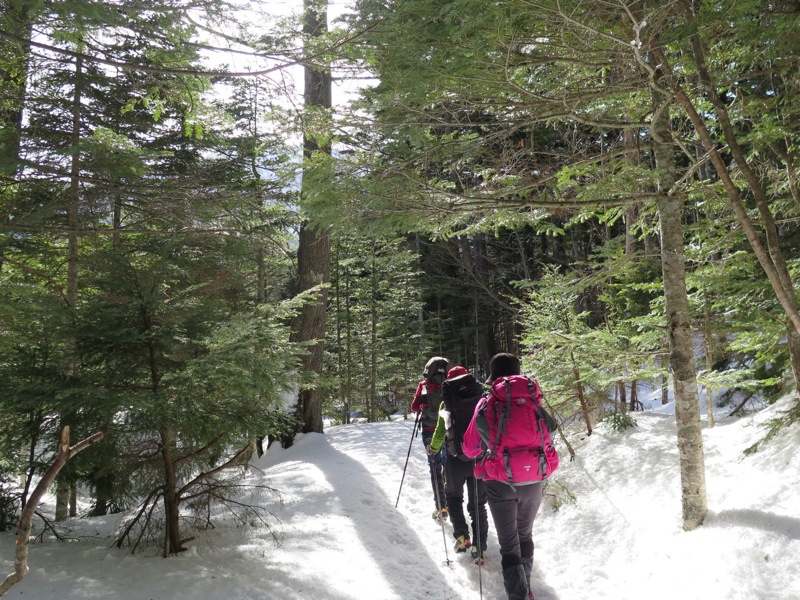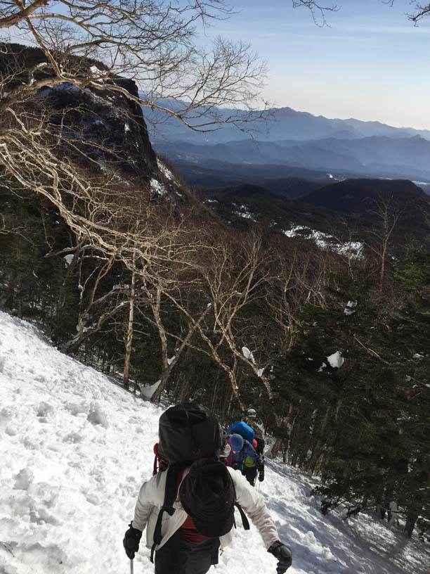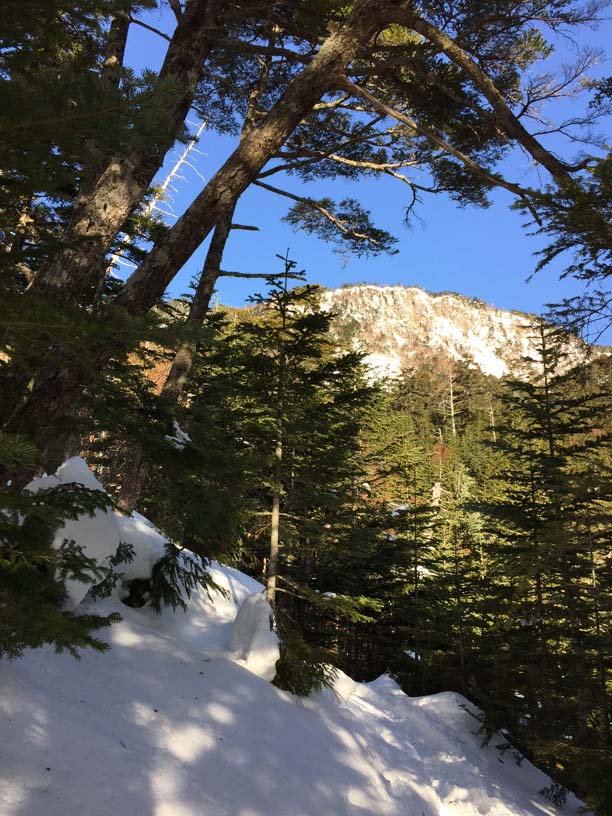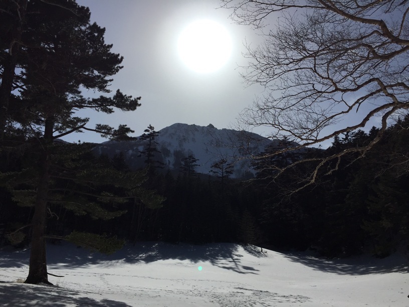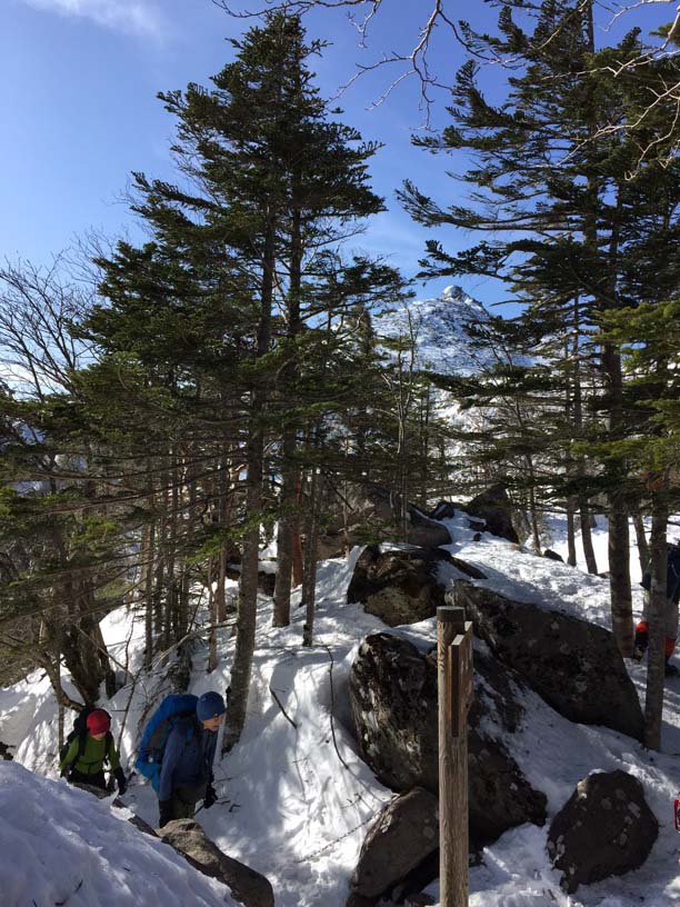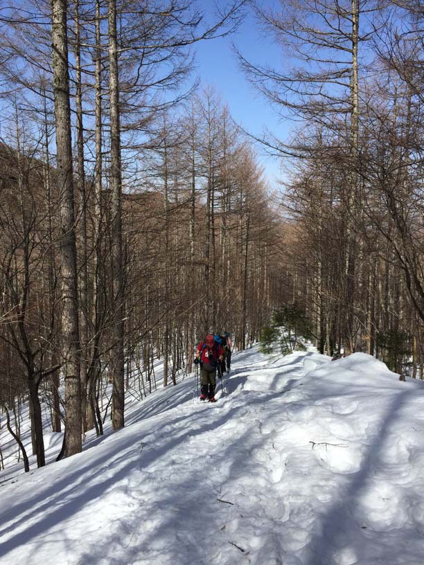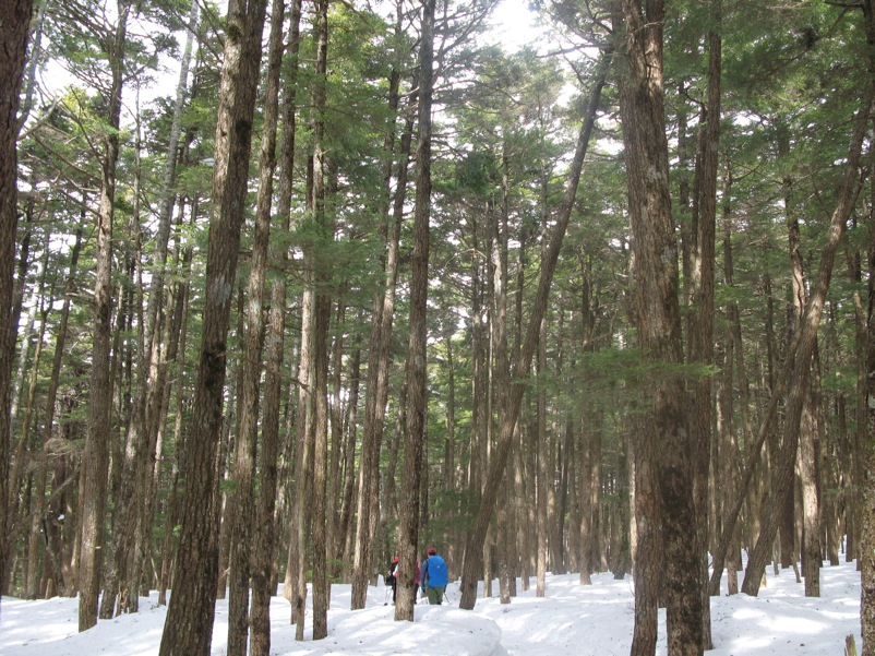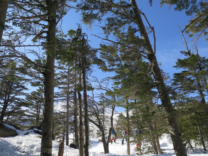 縞枯山の山頂からの下りはけっこうな急斜面です。今回のメンバーには岩山、雪山、海外の山と登山のエキスパートがいたので、このあたりから下で6本爪のアイゼンでの堅実な歩き方が指導されましたが、私は4本爪の軽アイゼンでテレマークポジション。ストックなしでも快適な雪の状態でした。積雪期、無積雪期、登り、下りいずれにしても自分の歩き方をチェックする絶好の急斜面です。