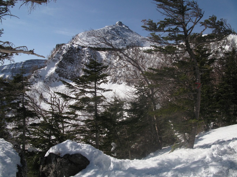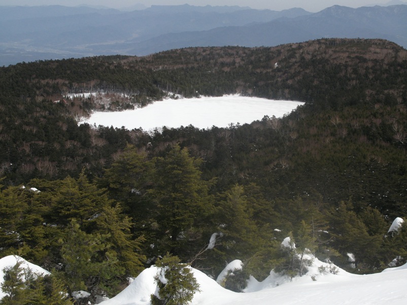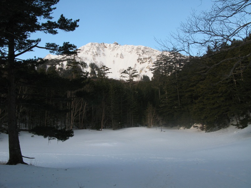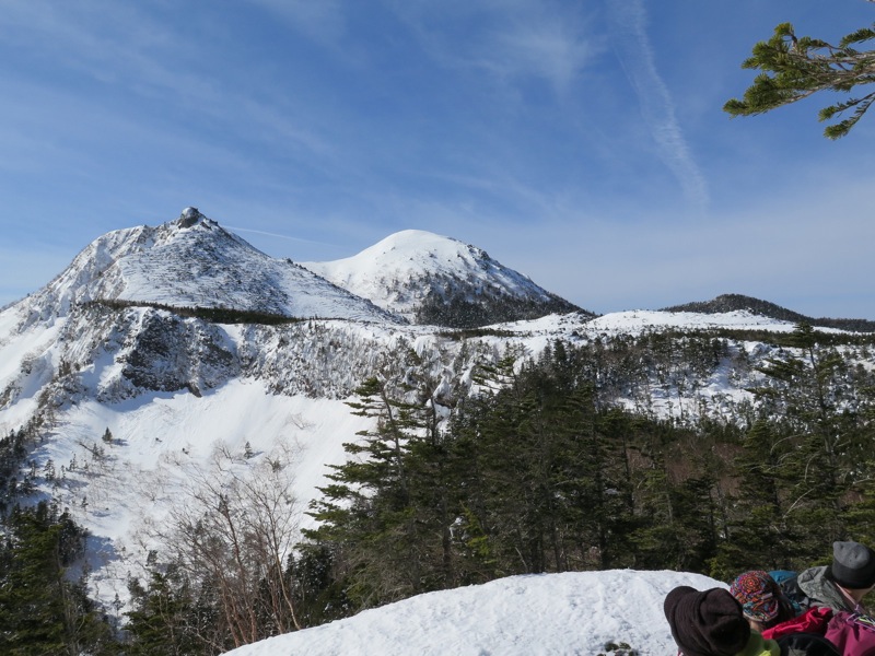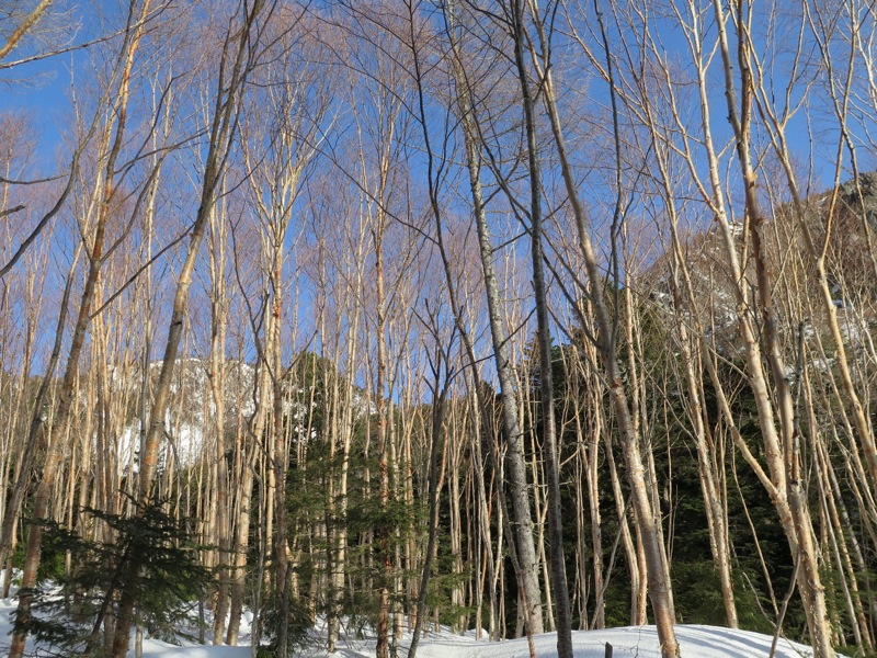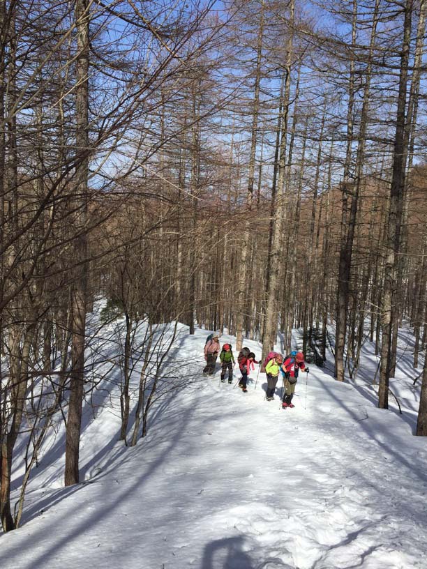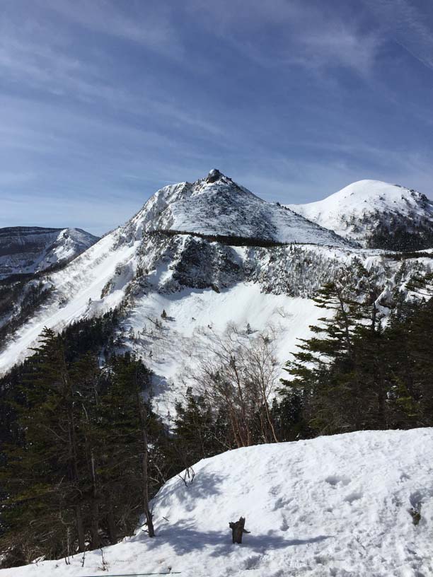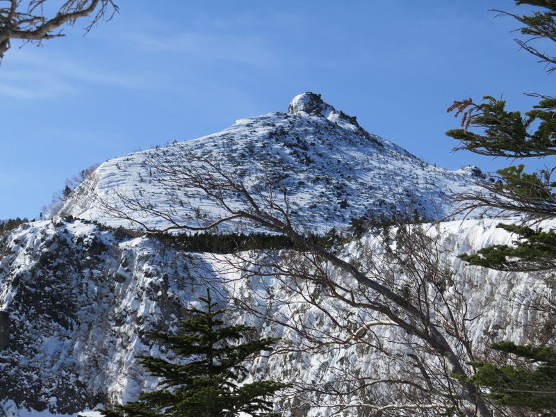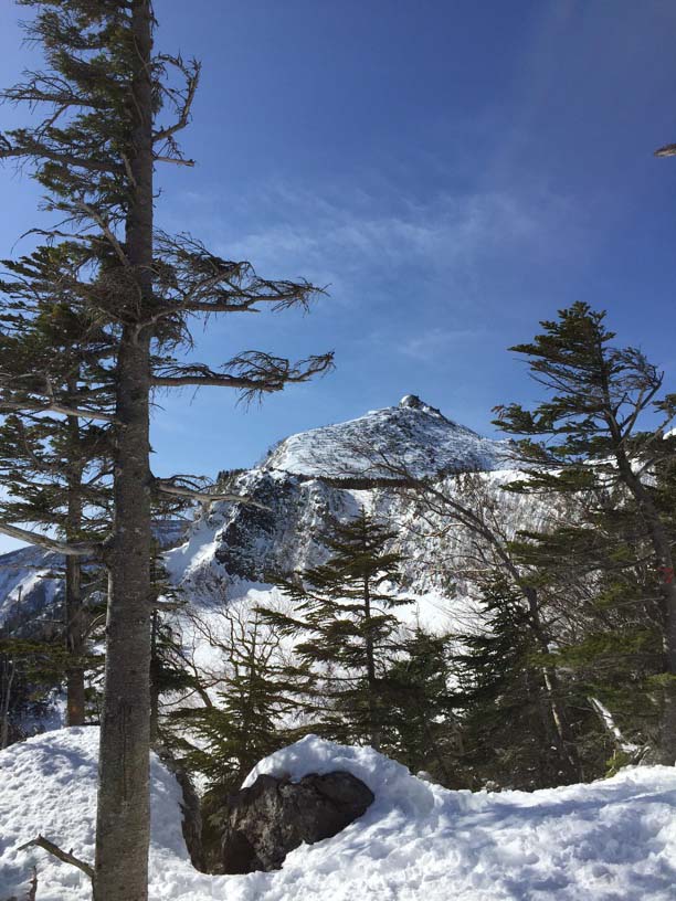 縞枯山の山頂からの下りはけっこうな急斜面です。今回のメンバーには岩山、雪山、海外の山と登山のエキスパートがいたので、このあたりから下で6本爪のアイゼンでの堅実な歩き方が指導されましたが、私は4本爪の軽アイゼンでテレマークポジション。ストックなしでも快適な雪の状態でした。積雪期、無積雪期、登り、下りいずれにしても自分の歩き方をチェックする絶好の急斜面です。