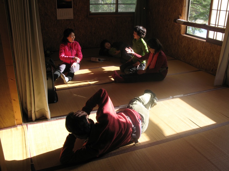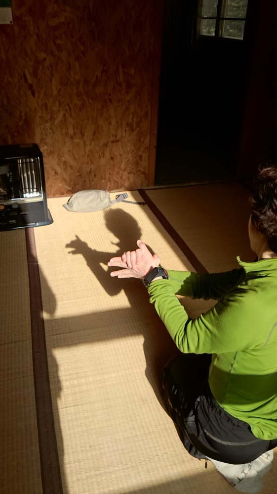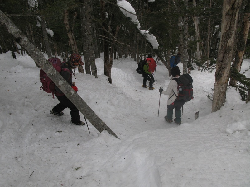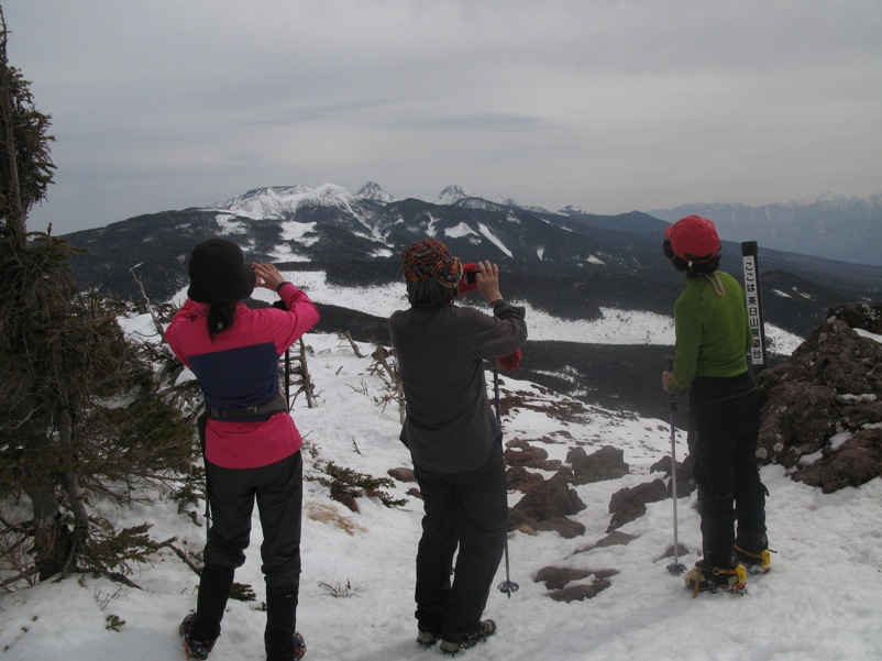 じつは、4本爪のアイゼンでそれなりの急斜面を登り降りしてもらうと、その人の歩き方がよくわかります。今回縞枯山の山頂からの急な下りで糸の会のベテラン会員が6本爪+ダブルストックで大騒ぎしていたとき、私は4本爪だけでストックを使わずに、テレマークポジションで気持ちよく下りました。急斜面では重心のコントロールが非常に重要だという大原則がそこでも明らかになりました。