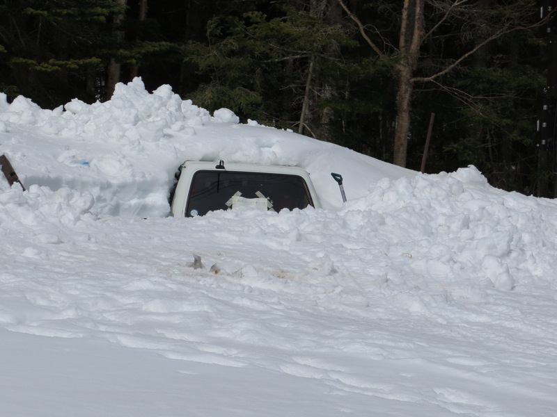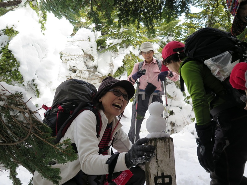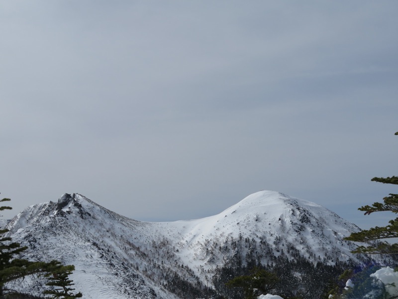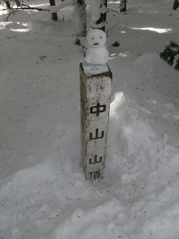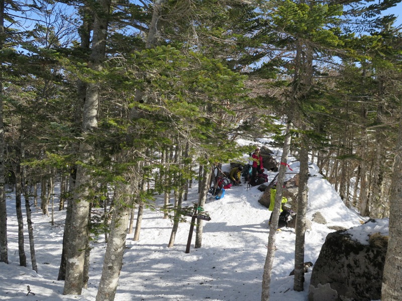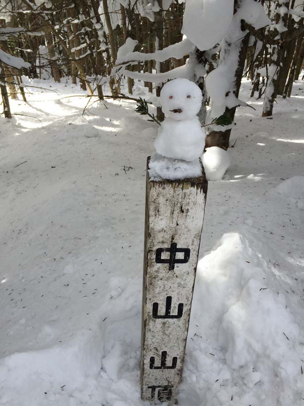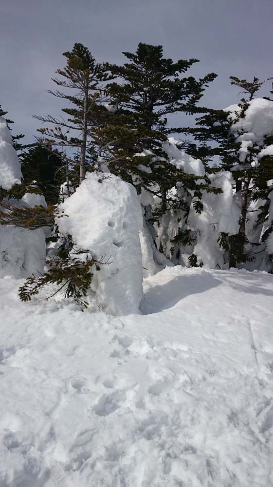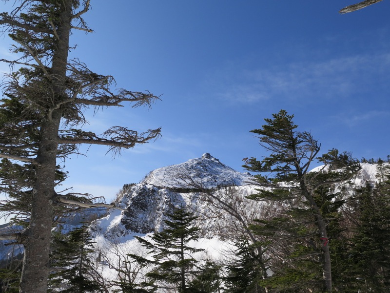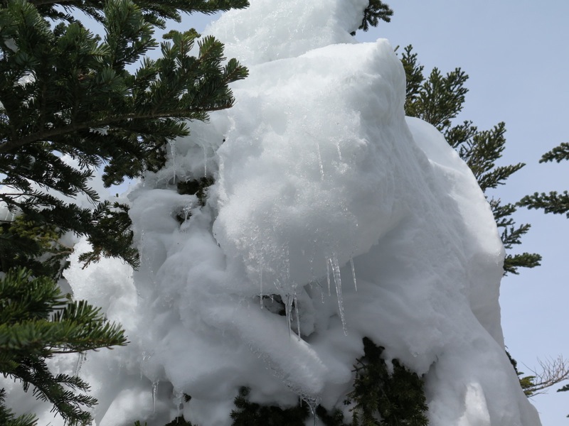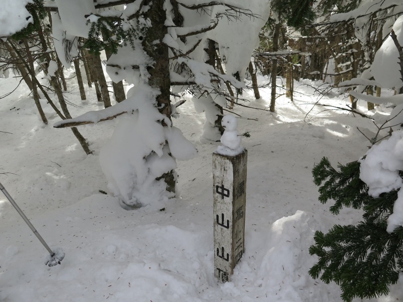 じつはこれ、縞枯山の山頂を通り越してホンの1分ほど行き過ぎてしまったところ。山頂の標識が雪に埋もれてしまったか、はずれてしまったかで、わかりにくい状態になっていました。同じように登山道をオーバーランしてしまった人がいると、往復の2本の踏み跡が重なるので。それに導かれてまたオーバーランが起こるという状態でした。
