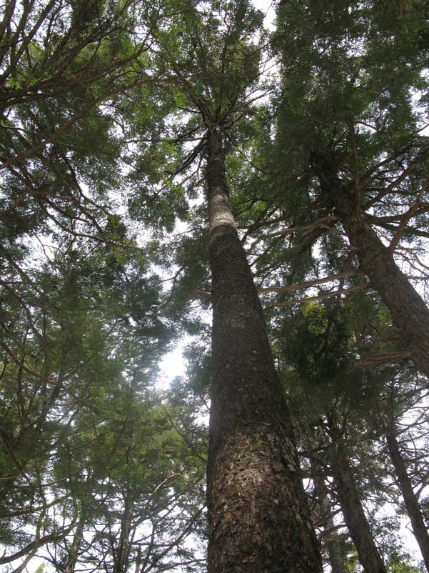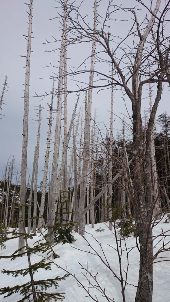 縞枯山の縞模様をつくるのがこの縞枯れ現象。シラビソやオオシラビソの森に限って起こることから特有の天然更新、つまり規則的な世代交代といわれています。縞枯れ部分は毎年1〜2mというスピードで斜面を上昇しているともいわれます。森林のこういう状態を安心して見ていていいのか、ちょっと戸惑います。