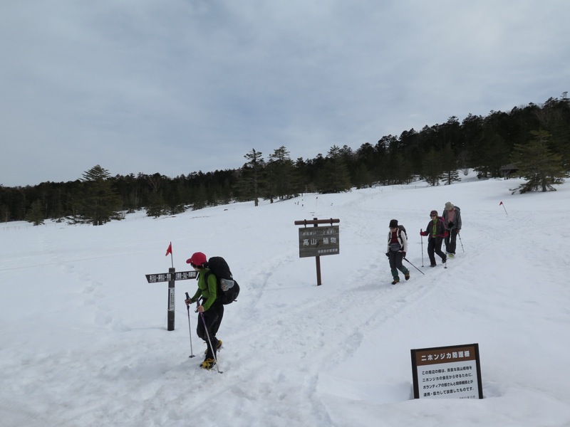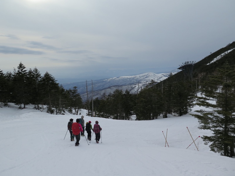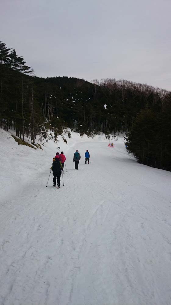 ここの写真を私は1枚しか出していませんが、基本的に登山者はスキーゲレンデに出てはいけないことになっているのです。私たちは16時00分の最終ゴンドラに乗らずに登山道を下ろうとしたのですが、導入部には標識があるものの、その先がわからなくなっていました。もちろん以前下ったことがあり、ものすごく快適なのでロープウェイには乗りたくないと思うほどなのですが、その入り口がわからなくなっていました。もちろんトレースもないわけで、うかつに下り始めると時間の浪費が夕闇を招きかねません。