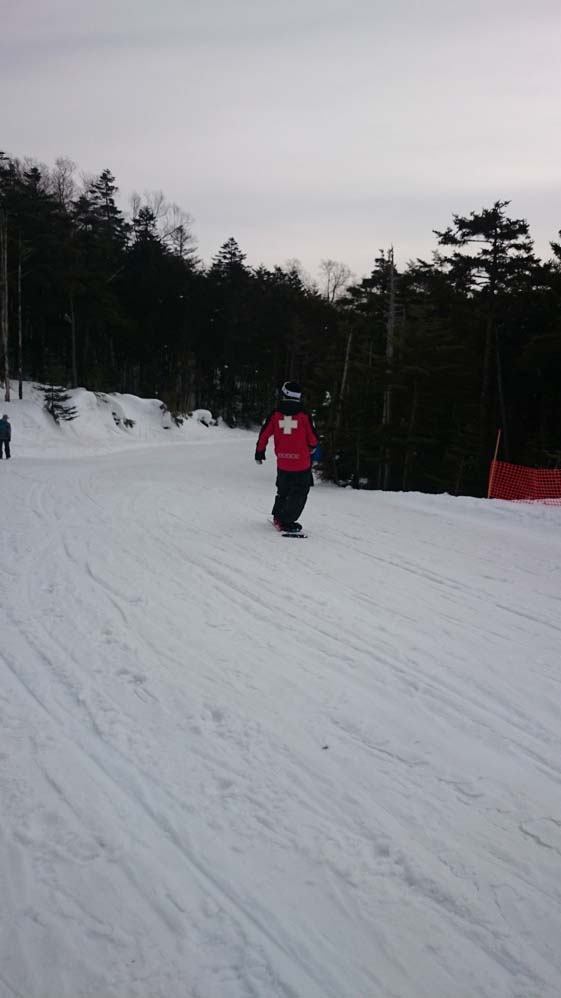 最終ゴンドラも下ったということで、おそるおそるゲレンデを下り始めたのです。するとゲレンデの最終確認をしながら下って来たレスキュー隊員の人が下って来て、できれば登山道がゲレンデを横断しているところから登山道に入るようにと注意されたのです。この写真でゲレンデが左に急カーブするところが登山道の横断地点です。