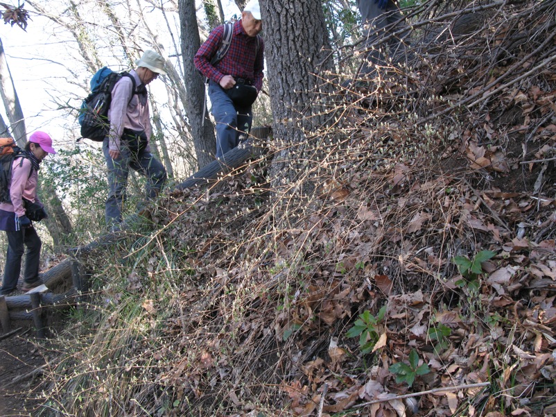 水平トラバースのはずなのに、なんだこれはと思いますが、小さな沢を渡るたびに急な下りと急な登りがあるわけです。ここは軽いハイキングのルートですので、念には念、という親切心からクサリを張ってあります。でも馬鹿にできないのは、冬にも「軽いハイキング」でこの場所を通る人がいるかもしれません。そういう山岳観光地が首都圏にはたくさんあります。