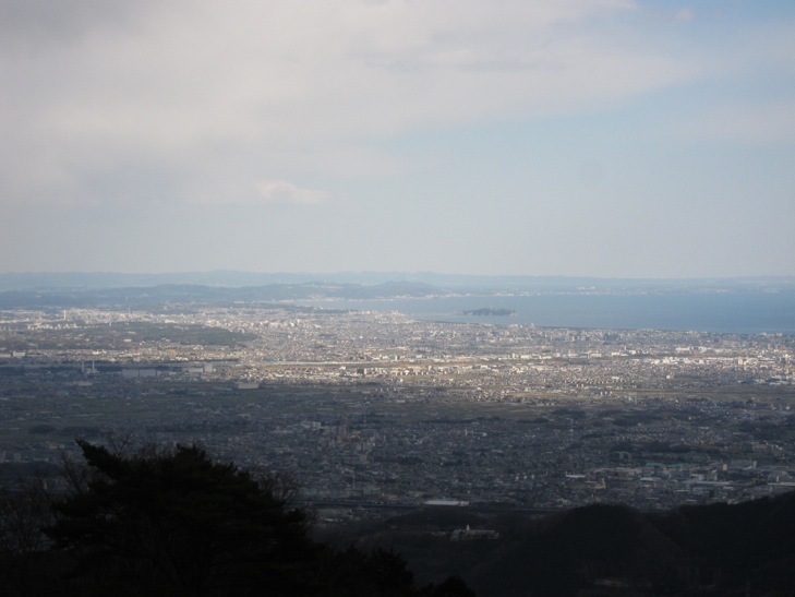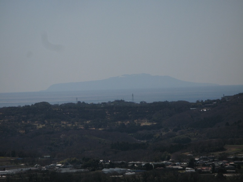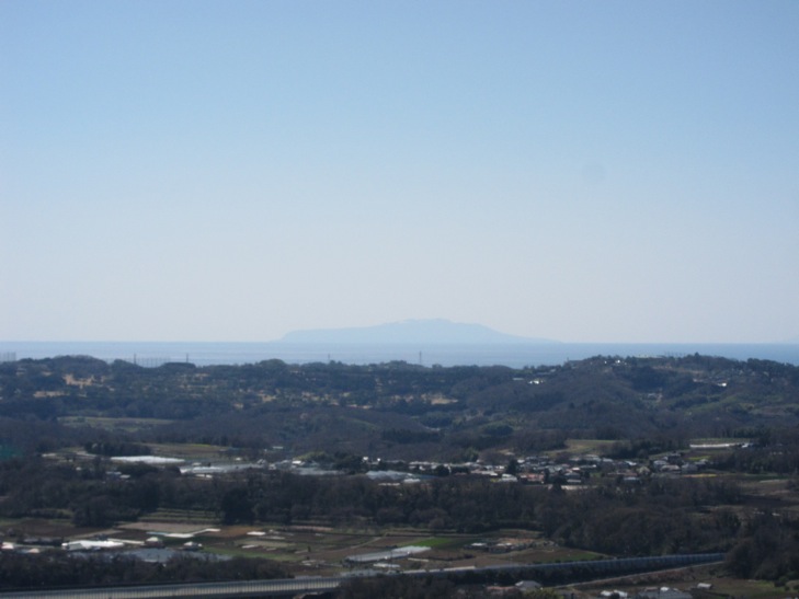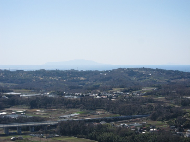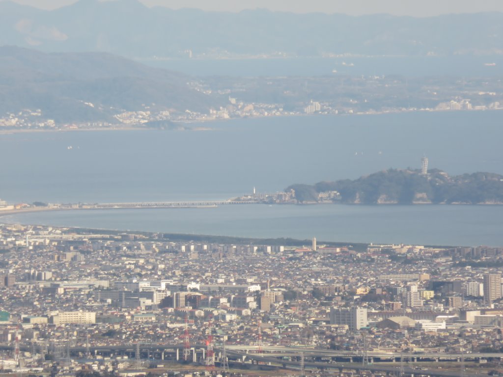 江ノ島が見えました。標高がだいぶ上がったので三浦半島の向こうに見える房総半島がかなり伸び上がってきたように思います。