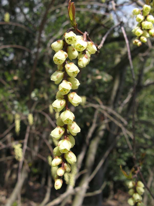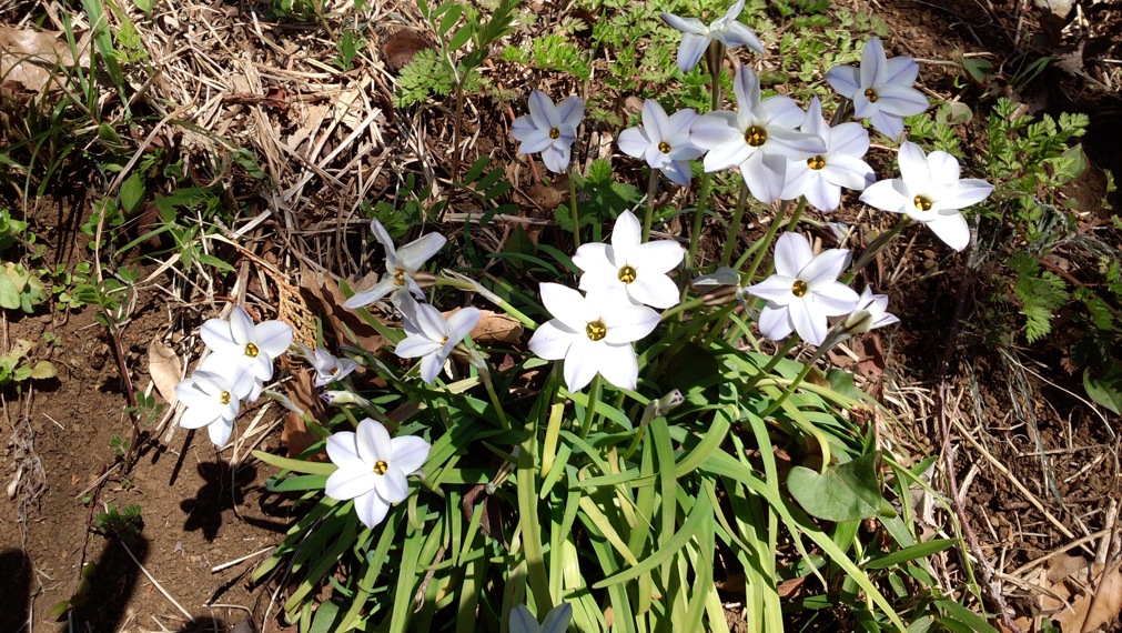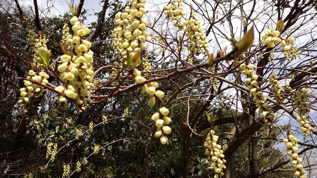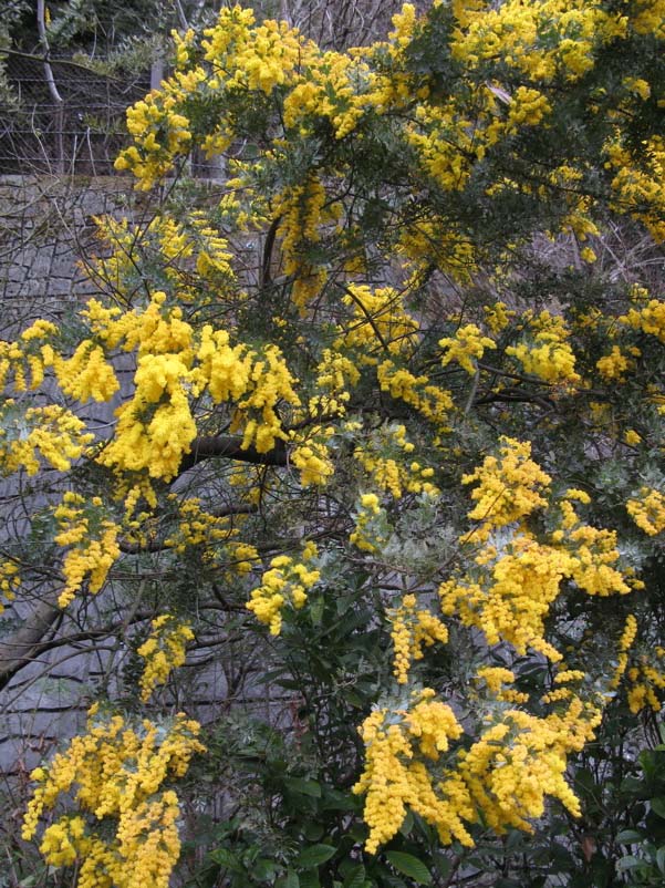 こういう洋花を出す必然はないのですが、ウグイスカグラの斜め向かいあたりにこのミモザが満開でした。私はくわしくないので帰ってから調べてみると、ちょっと興味深いことがらに関連していました。ミモザという名はラテン語に由来して、刺激で葉が動くようすが、古代ギリシャの無言劇ミモス(パントマイムの源流)に似ているということから名づけられたというのです。じつは私は日本のパントマム運動に一時期かなり関わったことがあるので「マイム」という言葉に反応してしまったのです。しかしよく調べてみると本来のミモザは「オジギソウ」で、ここにあるのは「フサアカシア」。フランスから輸入された切り花が「ミモザ」と呼ばれたのに始まる……とのことでした。