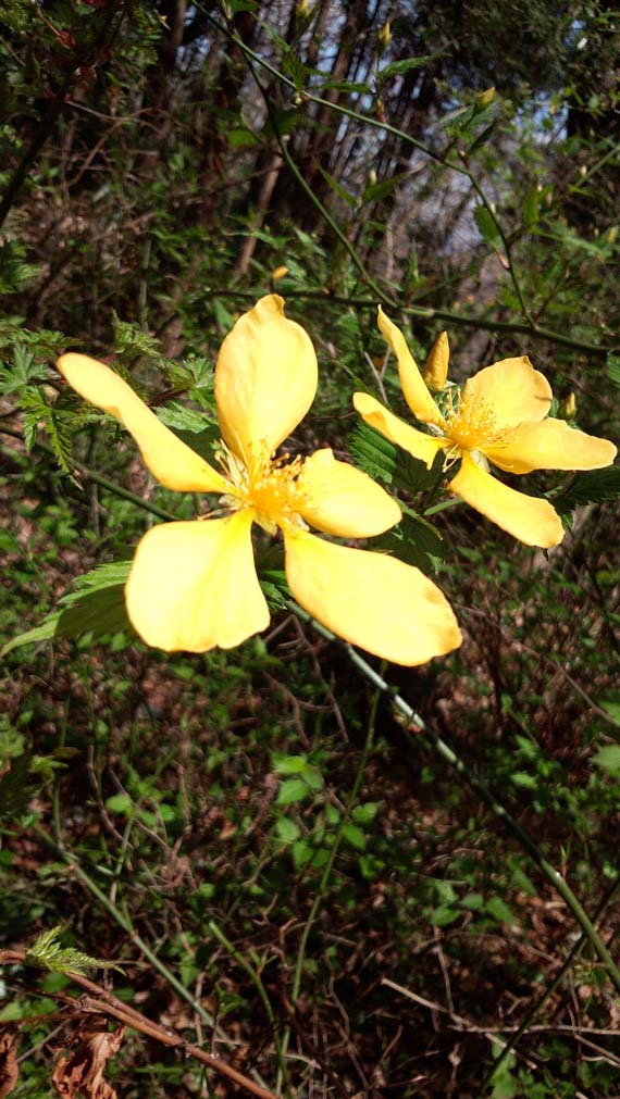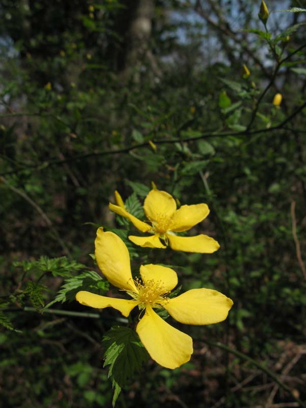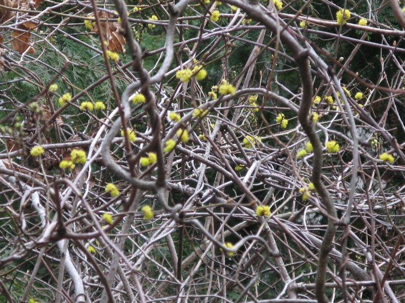 枯れ枝にポッチャリした感じで黄色い花が咲いています。ダンコウバイかアブラチャンということですが、見分け方は一点、花と枝との間にそれをつなぐ花柄があればアブラチャン、枯れ枝に花が直接咲いていればダンコウバイ……なんだそうです。