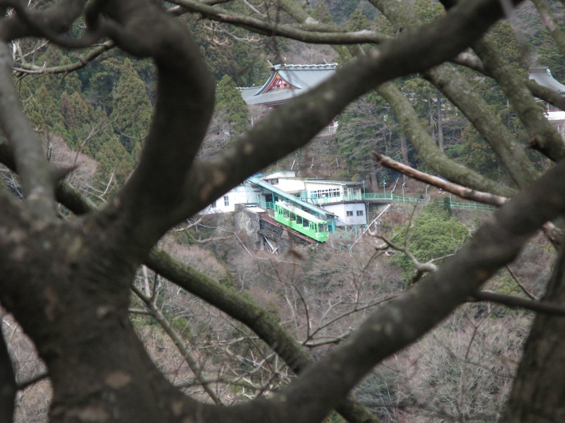 最後に休憩したところから、阿夫利神社下社とケーブルカー駅が見えました。蓑毛越の分岐から下社まではほとんど水平のトラバース道になっています。