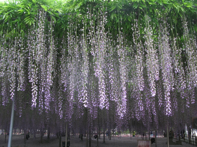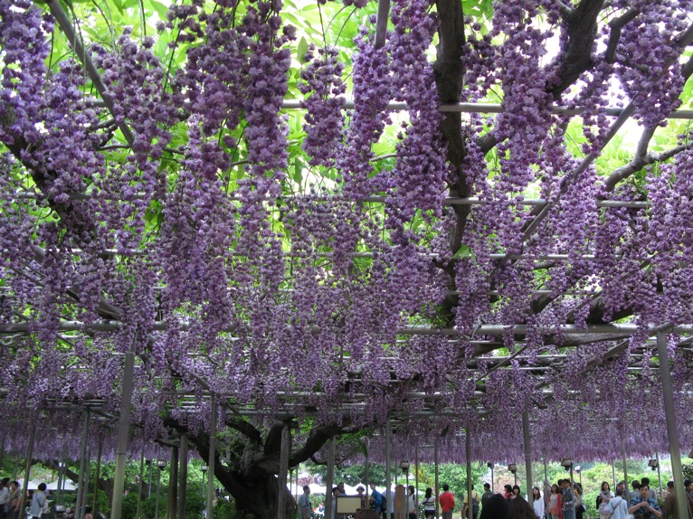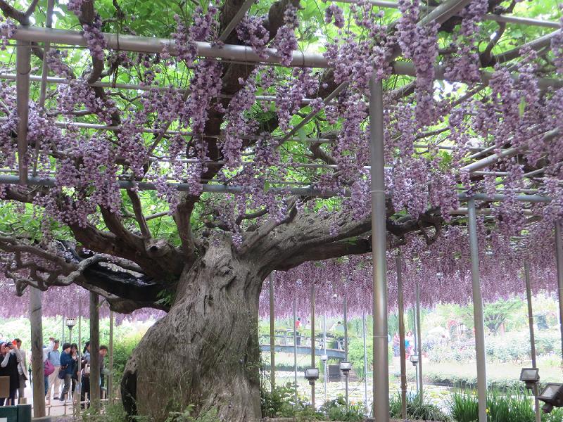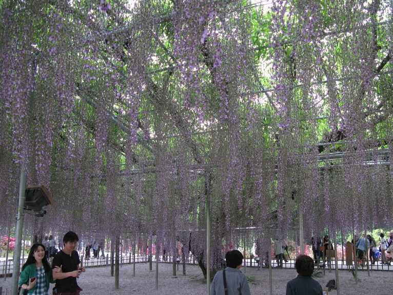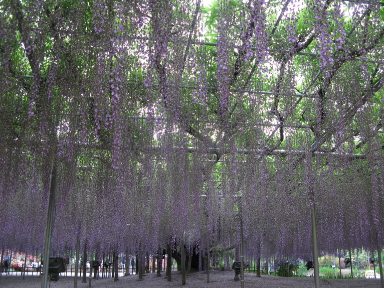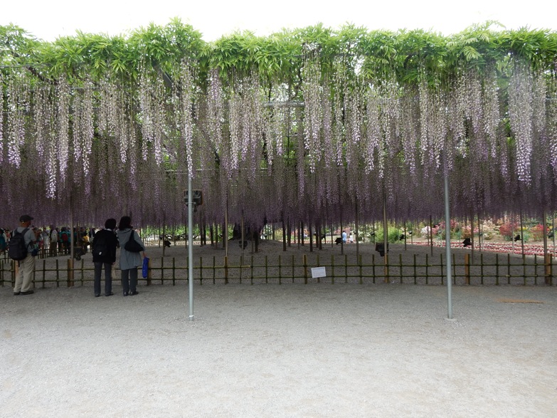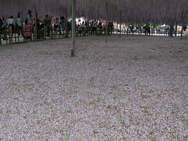 これは「足利のフジ・八重黒龍藤」という名前だそうです。フジとしては珍しい八重の花。25×35mに広がっています。地面を見ると、ポツポツと落ちた花びらがある程度……というところをご記憶ください。