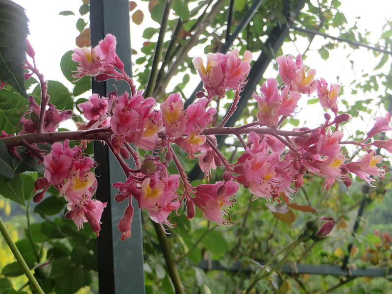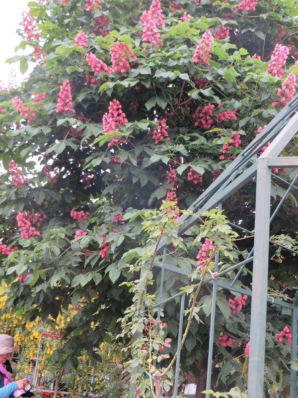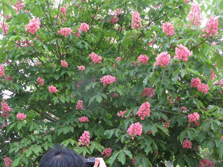 今が絶頂期という印象のこの木にはくわしい説明書きがありました。ベニバナトチノキというのだそうですが、マロニエとアカバナアメリカトチノキを交配し、それに再度マロニエを交配したところ、花の形はマロニエで、花の色は赤いトチノキとなったのだそうです。