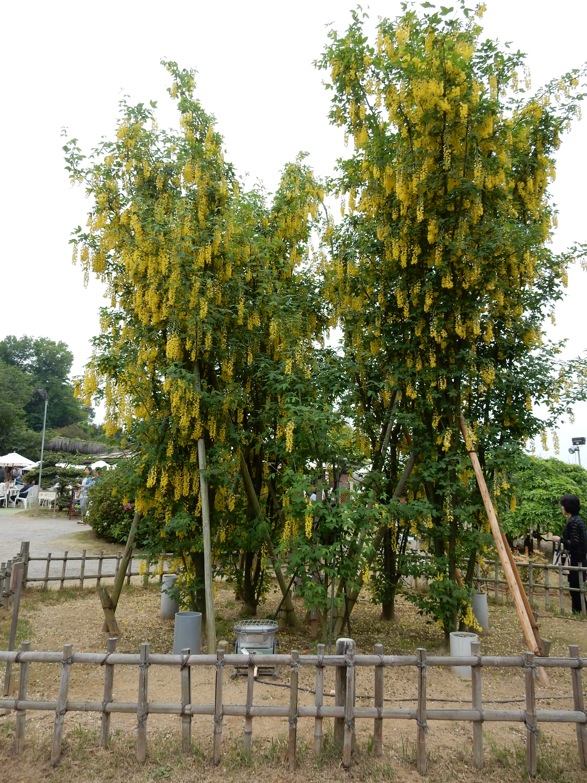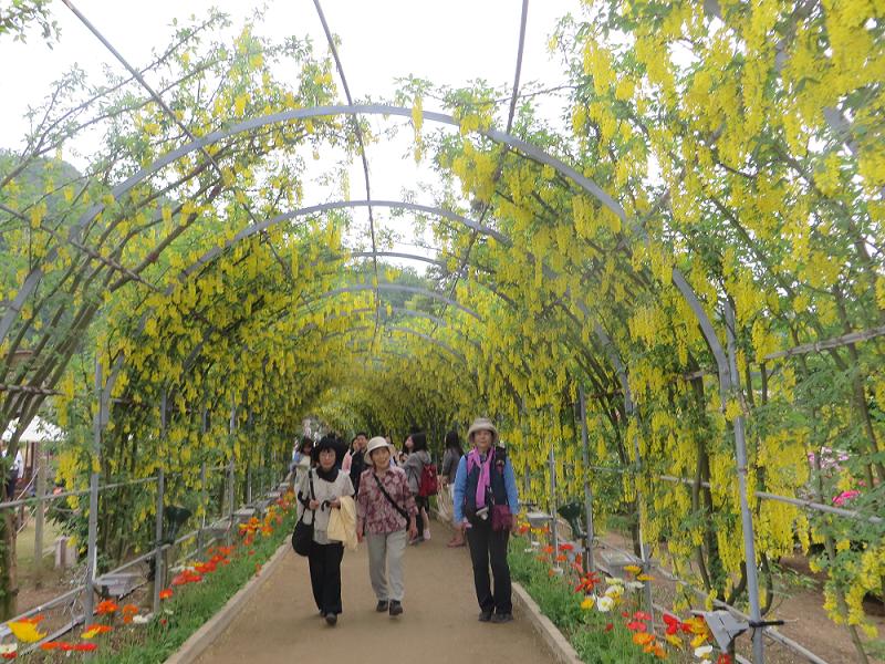 この時期のフラワーパークなので説明板ではキバナフジ(黄花藤)となっていましたが、和名としては「キングサリ」とか。何語かと思って調べたらなんと金鎖、英名のゴールデンチェーンの和訳そのままとか。日本のフジは奥ゆかしい空間を作ってくれますが、これはまさに飾り壁。