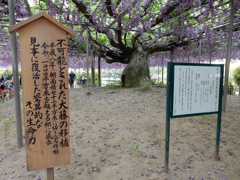塚本さんは1994年から大藤を運搬可能なサイズにまで切り詰めます。そして1996年に延べ2,000人で約20kmの大移動。3年がかりの準備によって1997年4月にあしかがフラワーパークは開園しました。大藤は50畳分に切り詰められてから、現在地で600畳に拡大したと説明書きにありました。