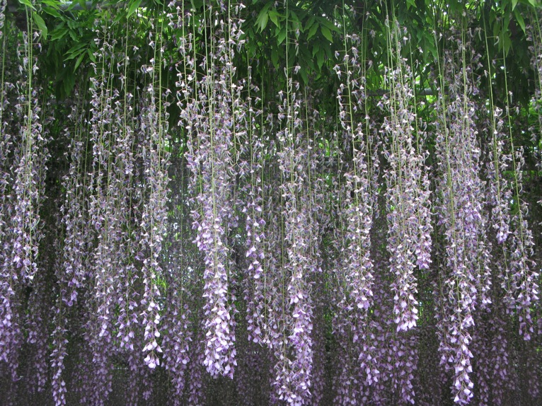 前の「八重黒龍藤」にもうすこし近づいてみると、花の房のボリューム感がわかります。これも樹齢140年とのことです。