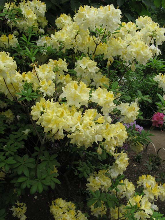 キバナフジのあとでこれを見たのでけっこう興奮してしまいましたが、これはゴールデンサンセットというのでしょうか、黄金色です。エクスバリー・アザレアという名が日本でも通用しているようで、日本のレンゲツツジに世界各地のツツジを交配して作り出した(というのは日本人の目から見ればという話かもしれませんが)英国のエクスバリー・ガーデンでつくった西洋ツツジ(アザリア)ということのようです。