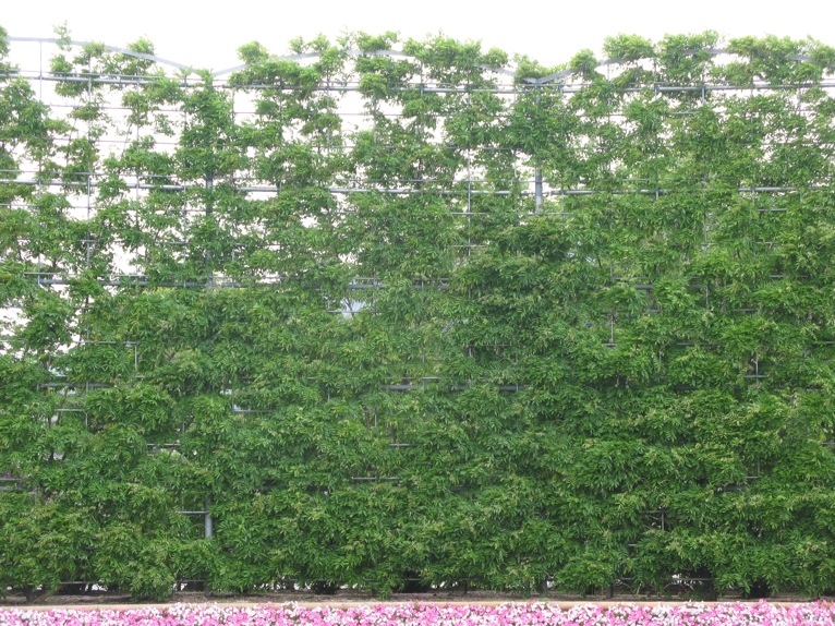 当時私の妻は「緑のカーテンブーム」に巻き込まれていましたから脇でけっこういろいろなことを知ったのですが、そのとき、ヨーロッパでやるとしたらフジのカーテンかなという話を聞いたのです。日本では天井に這わすような藤棚ですが、これをビルなどの側面に縦置きできれば落葉樹なので夏には日射しを遮って蒸散熱で気温を下げ、冬は葉を落として日射しを室内に呼び込んでくれる。しかも木なので、年々枝を張っていく。そういう理想の樹木であると知って、以来フジを軒にはわしているような家を見ると注目するようになっていました。これはそのいい見本なのです。