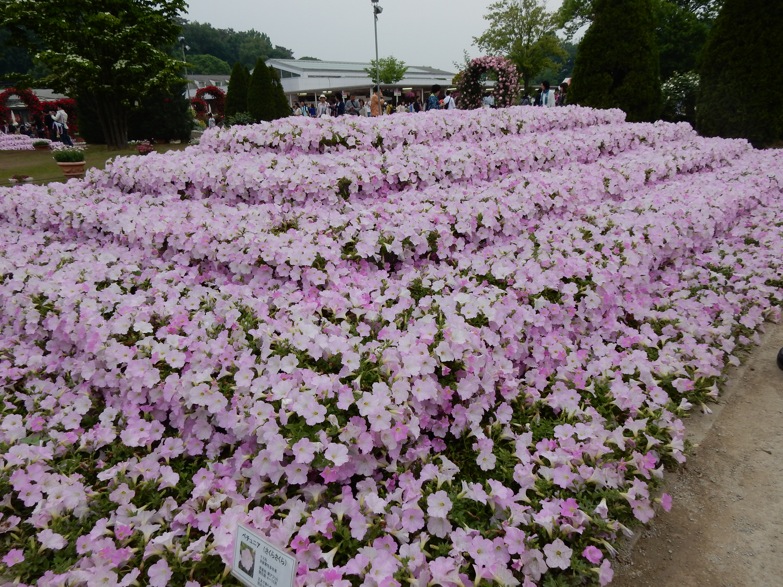 ペチュニアで飾った花壇。南米からヨーロッパへ伝わって、改良された花だそうです。日本へはツクバネアサガオという名で輸入されたとか。