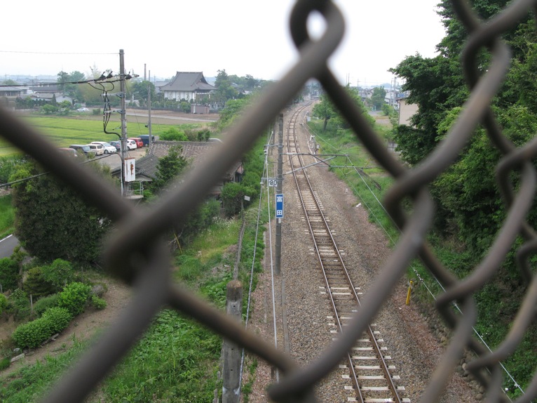 あしかがフラワーガーデンと富田美術館の間に、JRの線路をまたぐ橋があります。大きな屋根は駅を降りて昼食休憩をした東洋院。そのすぐ左には造り酒屋の古い煙突が立っています。あそこから出発して、また戻ろうとしています。