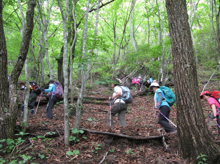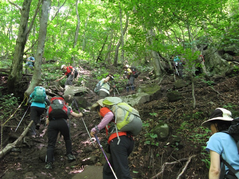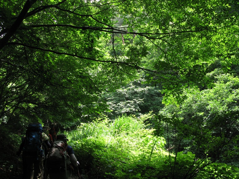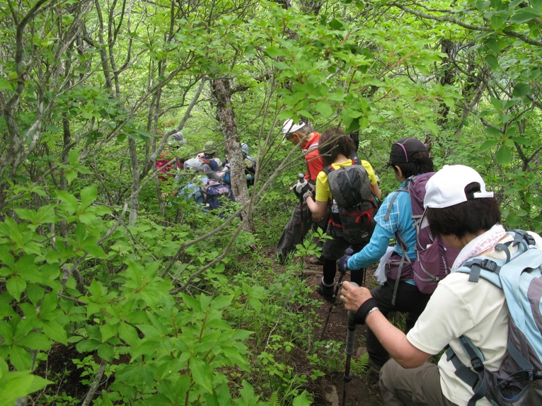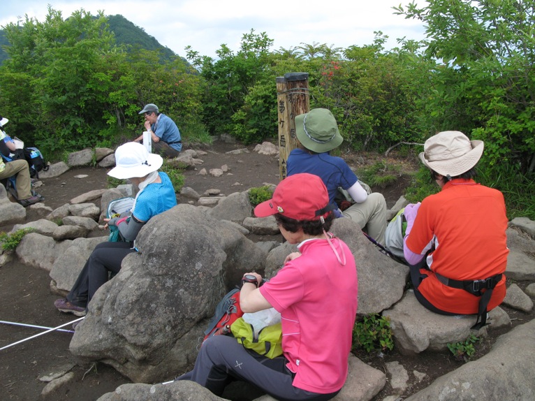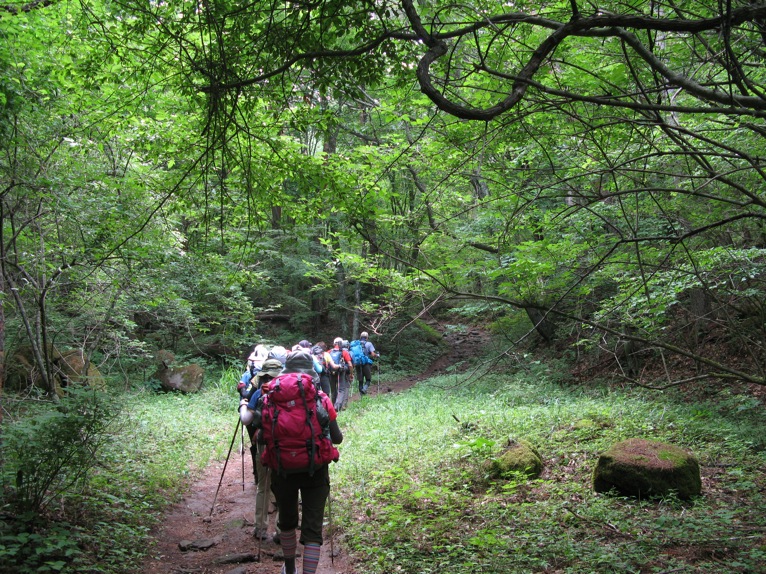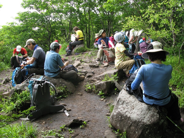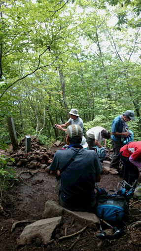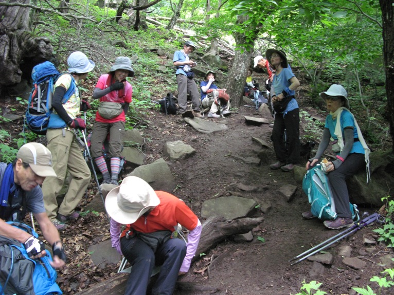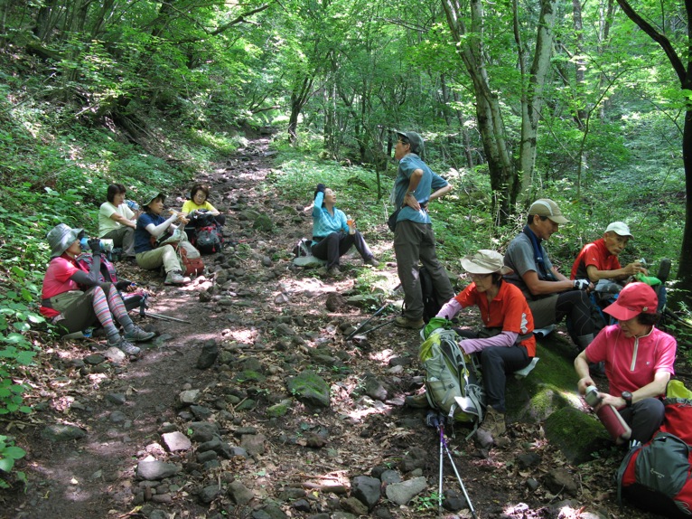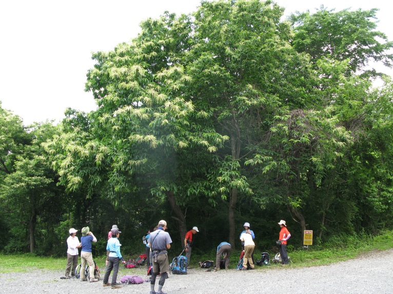 気温は半袖Tシャツ1枚というところ。女性の何人かはつけ袖? をしています。虫除けの人もあれば日焼け防止の人も。最近のUVカット機能はすばらしいもので、ソーラー電池の腕時計をこのつけ袖の内側に入れて泊まりがけで山を歩いていると電池切れで止まってしまう、という話を前回Sさんから聞きました。