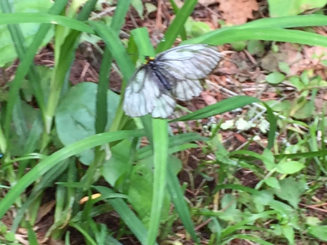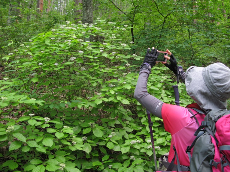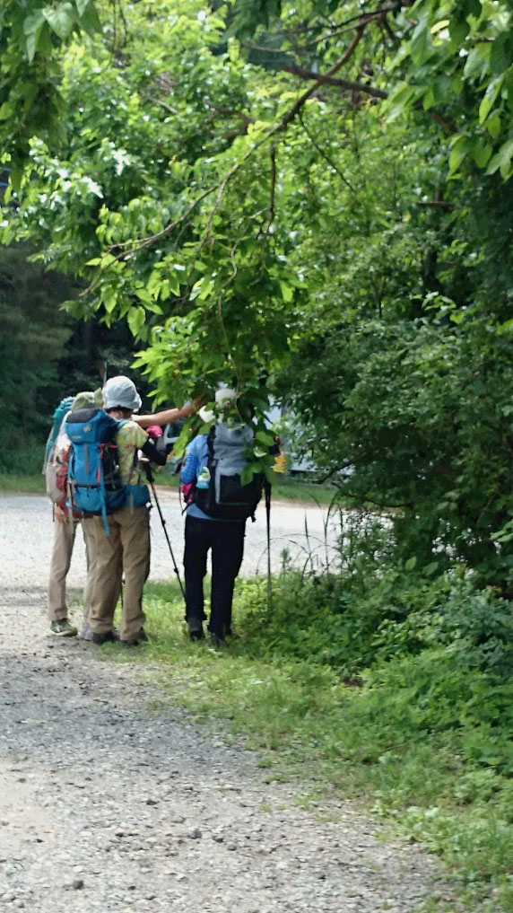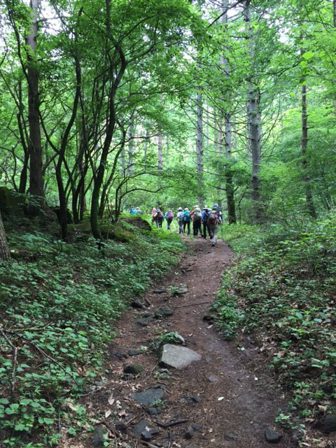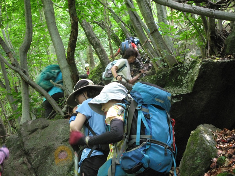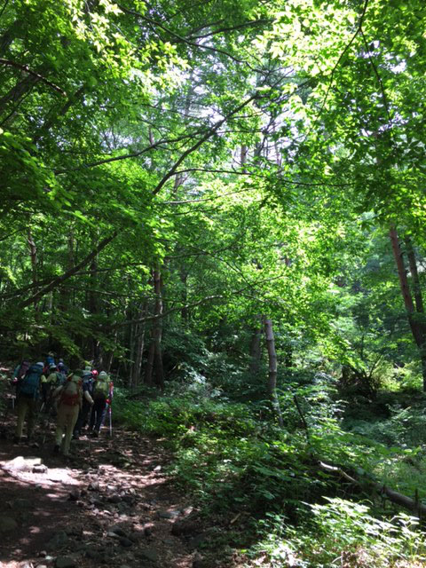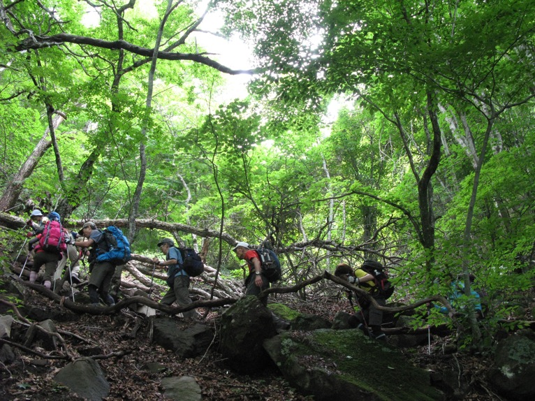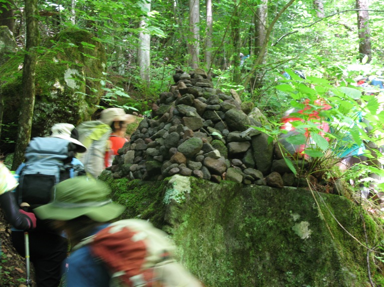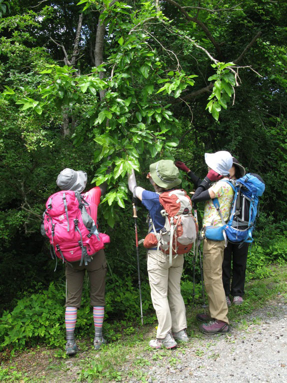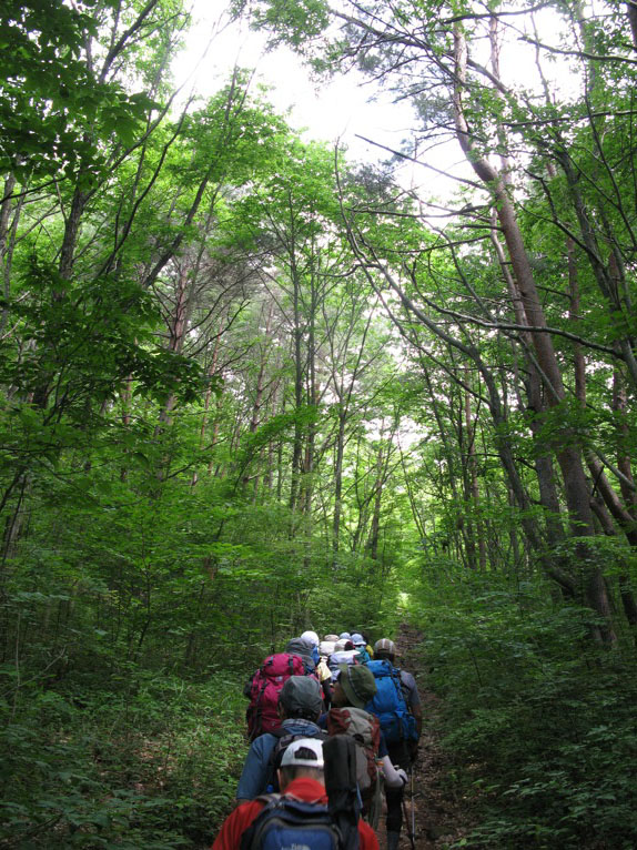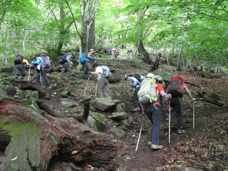 気温は半袖Tシャツ1枚というところ。女性の何人かはつけ袖? をしています。虫除けの人もあれば日焼け防止の人も。最近のUVカット機能はすばらしいもので、ソーラー電池の腕時計をこのつけ袖の内側に入れて泊まりがけで山を歩いていると電池切れで止まってしまう、という話を前回Sさんから聞きました。
