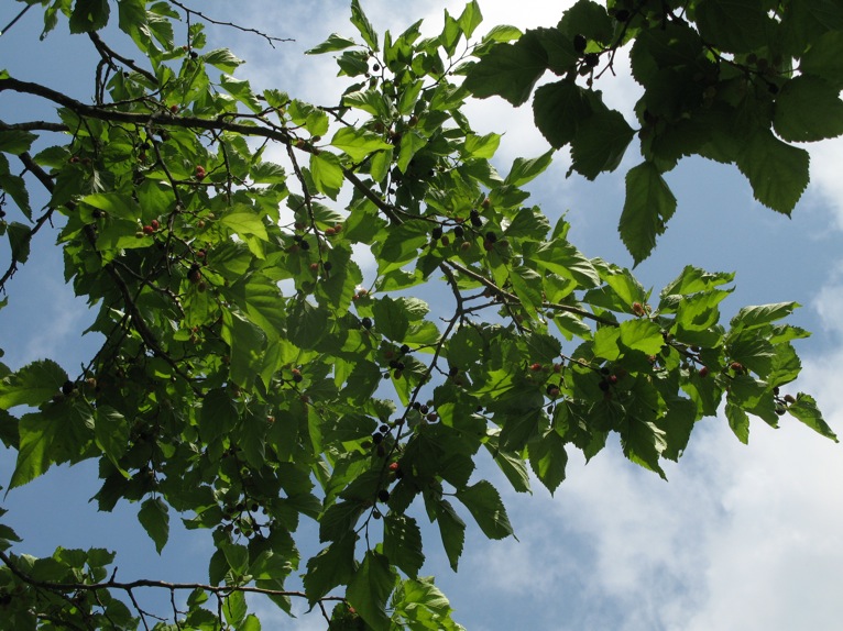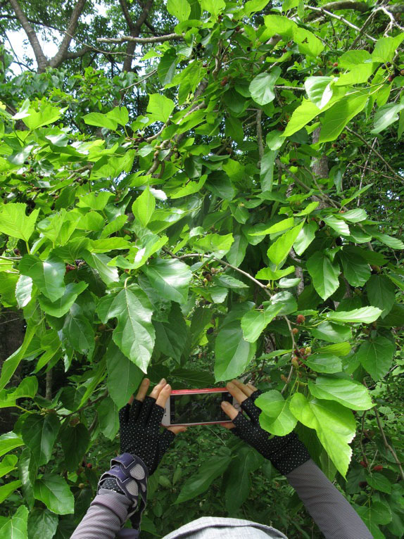 養蚕地帯のクワと違って、ここのオオキナクワノキは本当に巨木です。おいしそうな実が「ここまで届くかな?」と見下ろしていました。シャクだけれど。