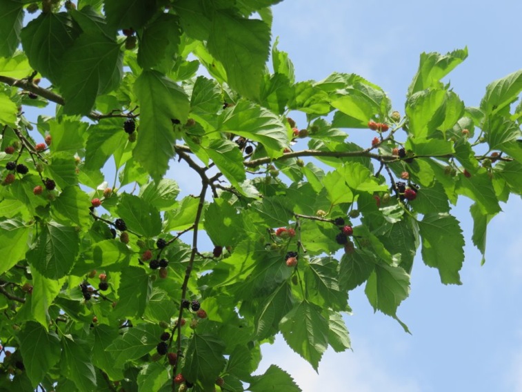 スタートして間もなく道端に現れた クワの実。早速 熟した黒いのを頬張る。初めて 食したけど 結構 イケル。
