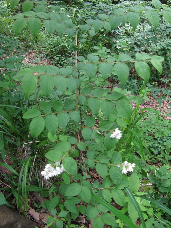 ウツギのたぐいだとは思いましたが、何ウツギだか。……ということで帰って調べてみるとただのウツギ(卯の花)かもしれません。……が、葉先が尖っていないのでマルバウツギかもしれませんが、ウツギにも葉のかたちにはいろいろあるようで、これ以上は写真からではわかりません。