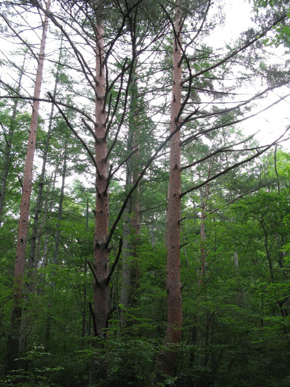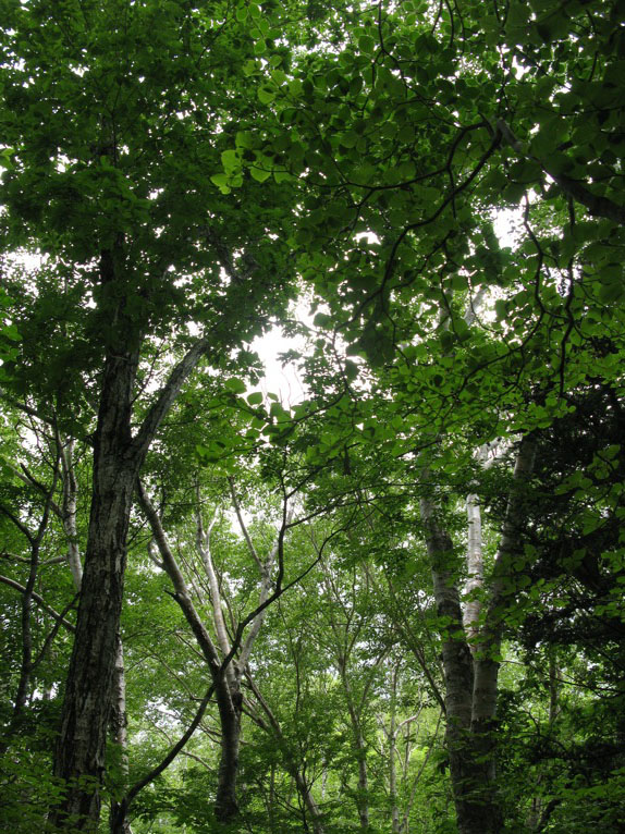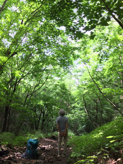 下りきったら、こんどは登り返します。そこでひと休み。見上げるとここも文句なしの深い森です。