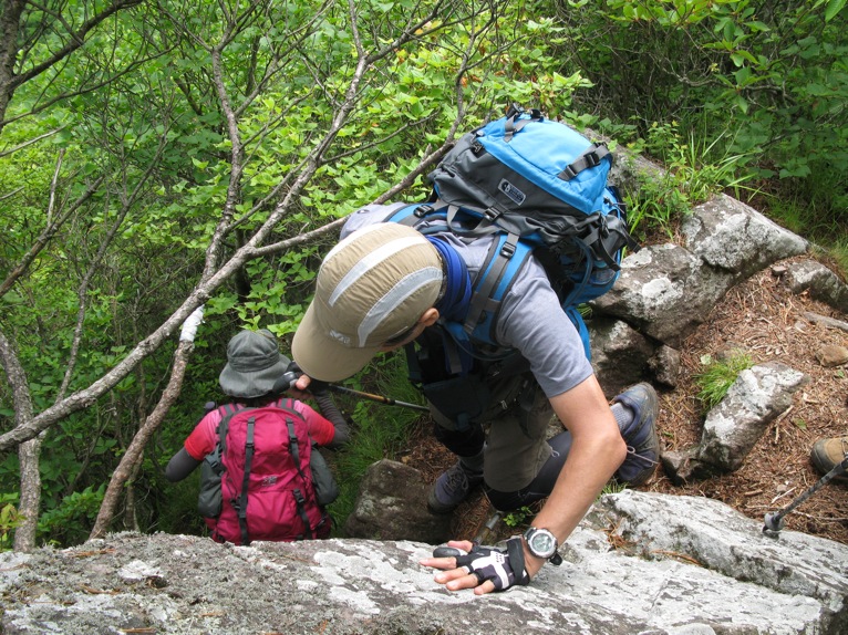雷雲はいつまでも動きがない感じで、山裾はなんとなく明るい雰囲気。岩場の下りは、これまであまり危険という印象は残っていませんが、それは先頭で全員の動きをコントロールしているときの気分。最後尾で、悪銭苦闘しているらしい人の動きもよく見えない立場とでは、ずいぶん違うと感じました。ハラハラドキドキまではいかないけれど。