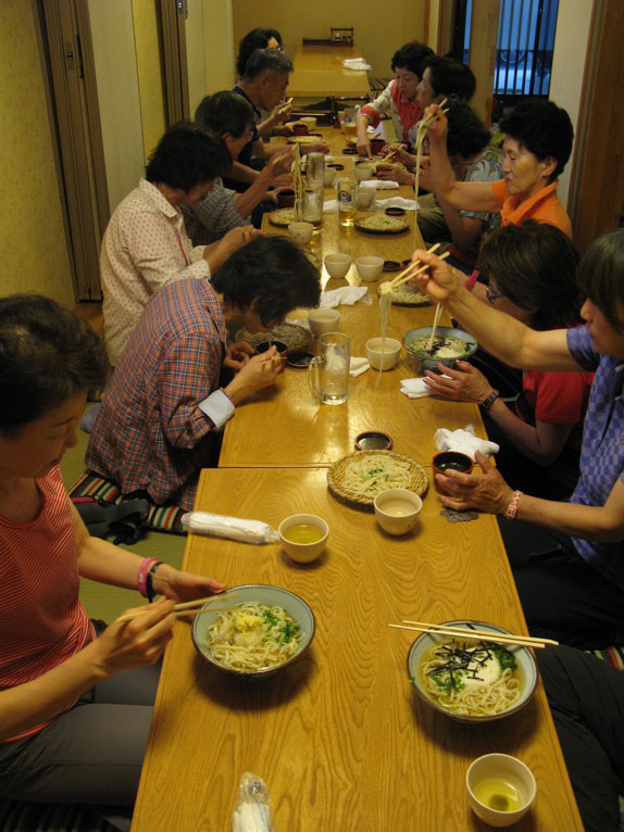千葉方面に帰る人は、可能なら何としてでも千葉行きの特急あずさ30号に乗ろうとします。駅近くの手打ちうどん・ふじえでは全員「おざら」(冷やしほうとう、あるいはそのバリエーション)を頼みました。このテーブルの奥の方のみなさんです。