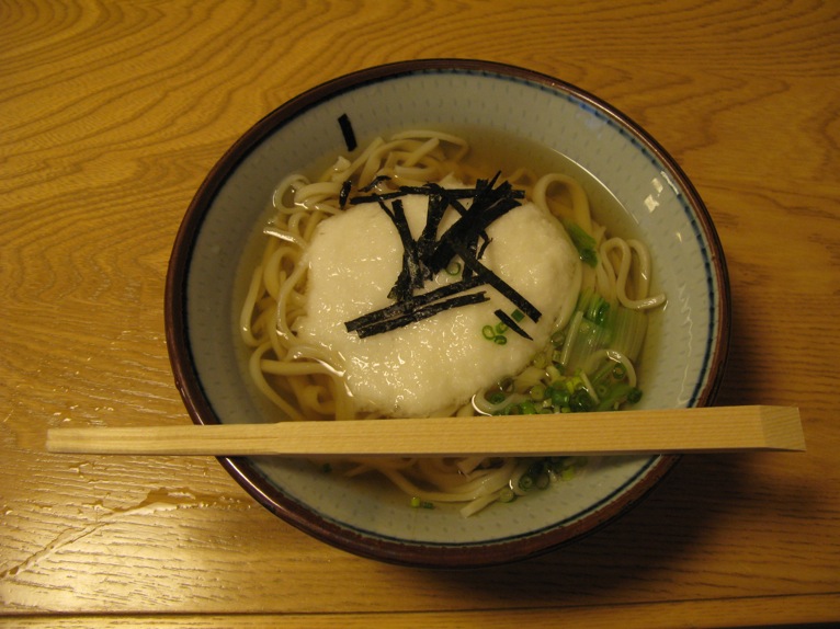 これは冷たいとろろうどん。千葉行きあずさに乗れなくてもいい人たちはもうちょっと手の込んだうどんを注文しました。この店はなかなかの人気店で、酒のさかなも期待していい感じですが、この種のうどんもおすすめです。