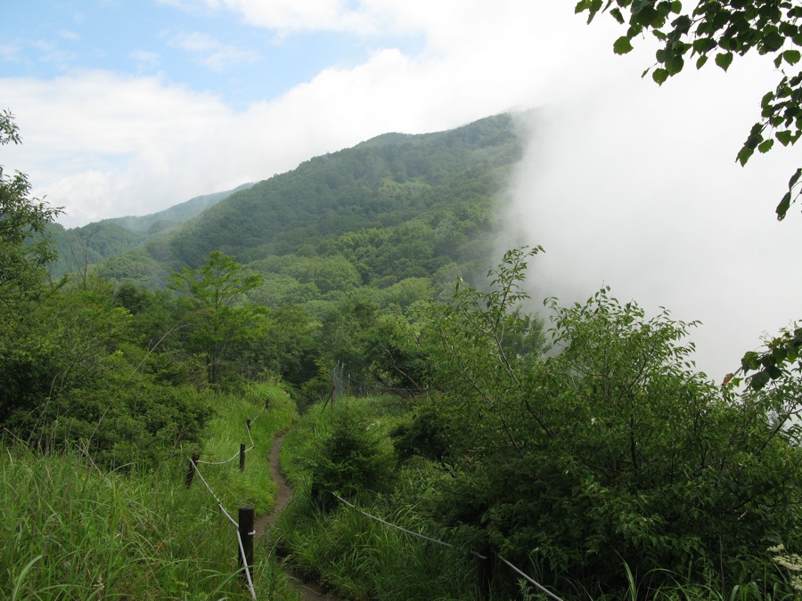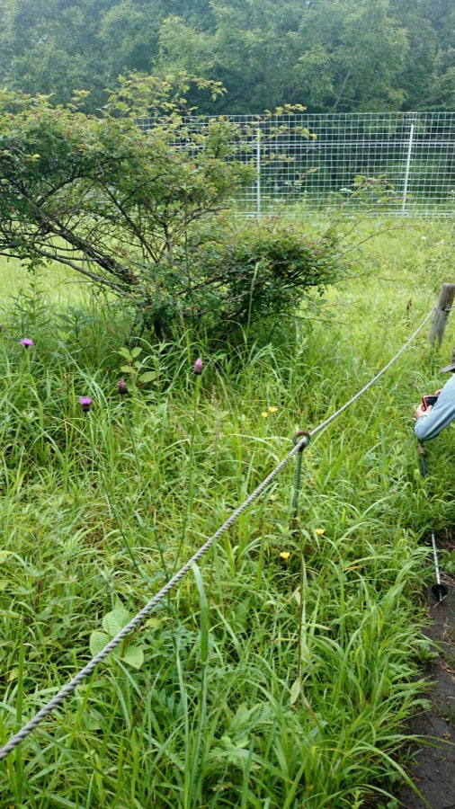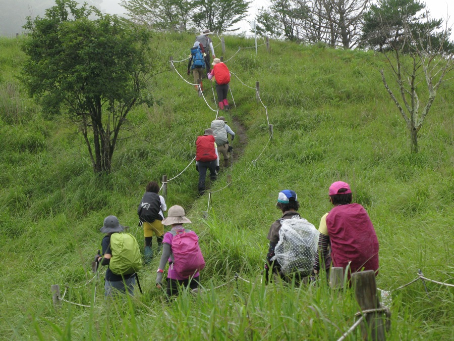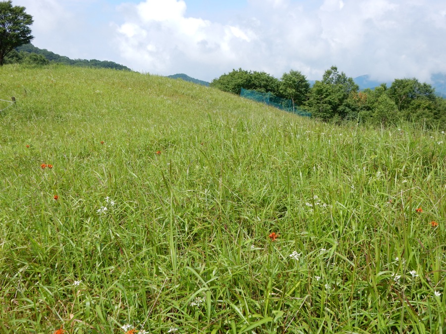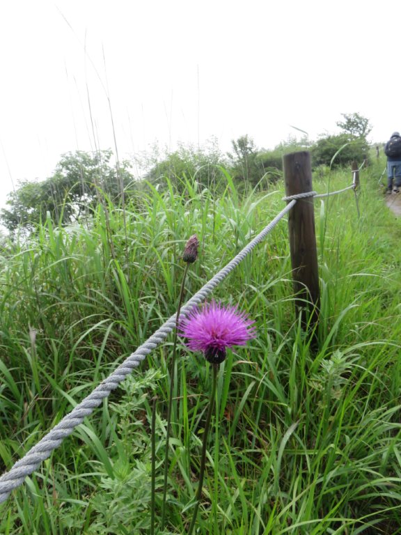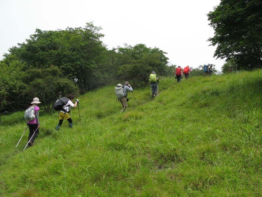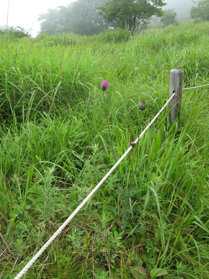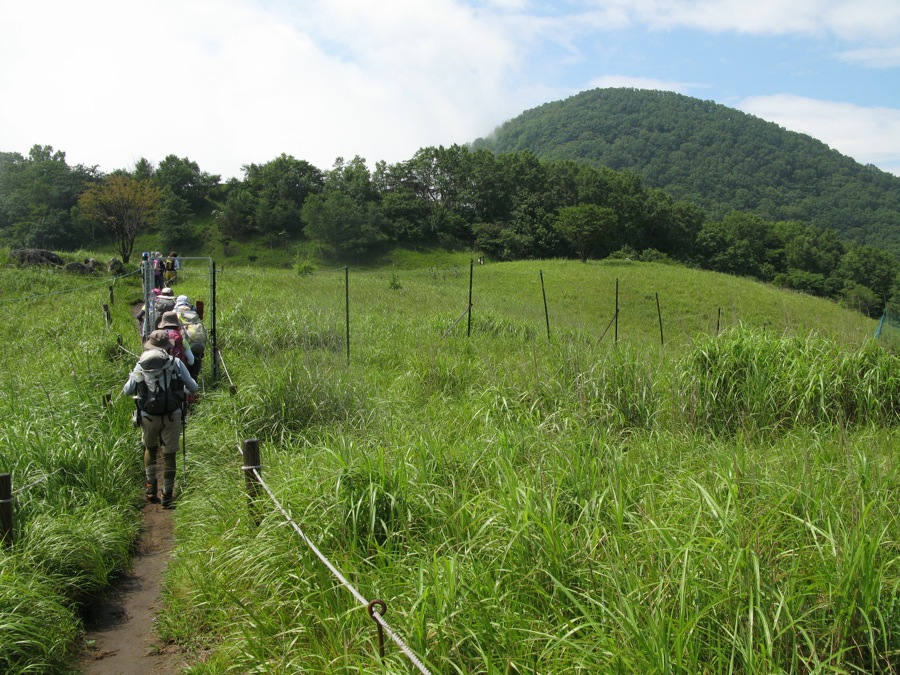 *ところが数年前に大谷ヶ丸中腹のレンゲショウマが突然姿を消しました。そして19回目のこの日には、青々とした草原と、登山道を仕切る確固たるロープ、シカを寄せ付けないという柵囲い……と、大きく様変わりしていました。参加者の中には2000年の夏に有無をいわさず連れてこられた人も何人かいたので、15年間のこの稜線のドラマをかみしめる気分が濃厚でもありました。