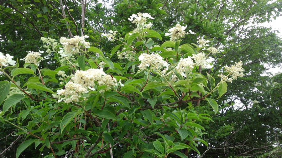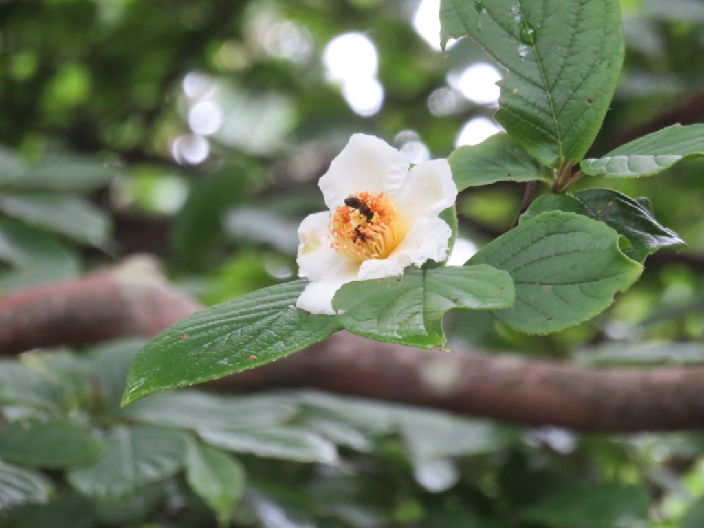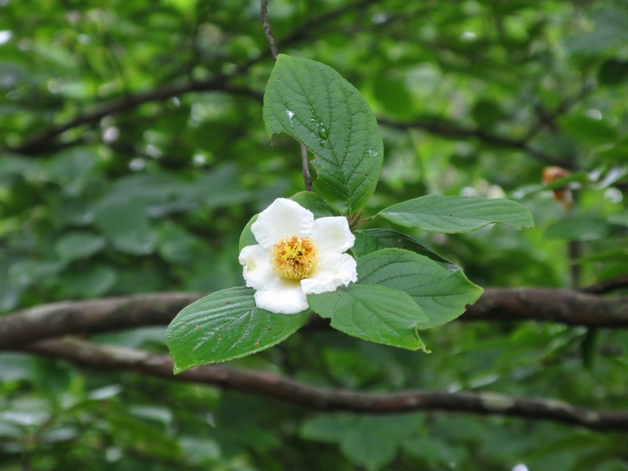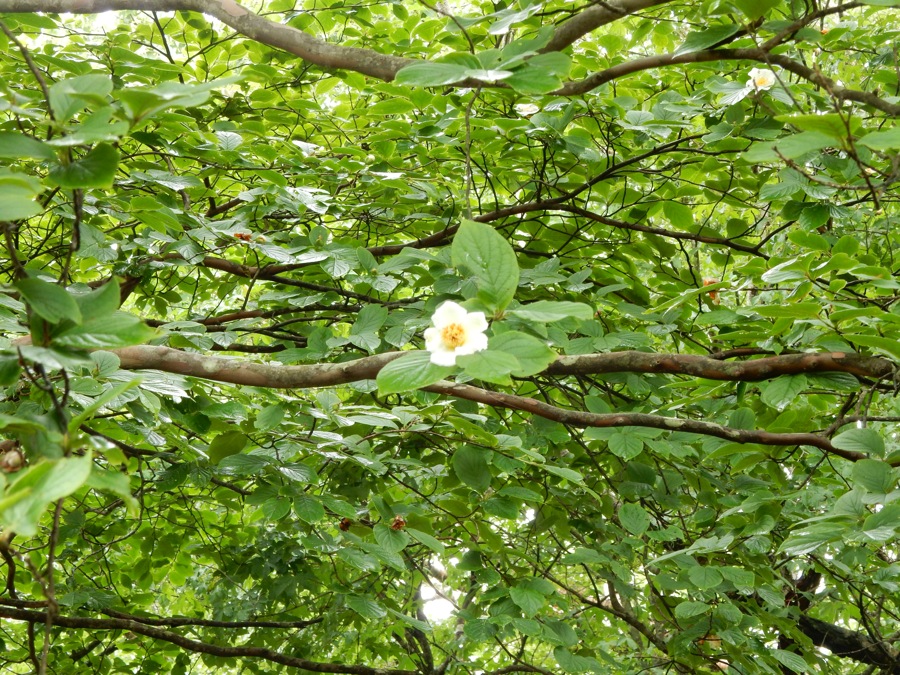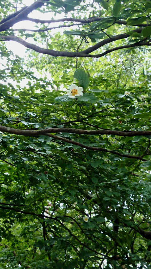 ふだんの山歩きでは、白いツバキの花が足元に落ちているのでナツツバキの木があると分かるのがふつうです。ここでは道下の木の枝が目の前にあって、ナツツバキの花に初めてご対面。