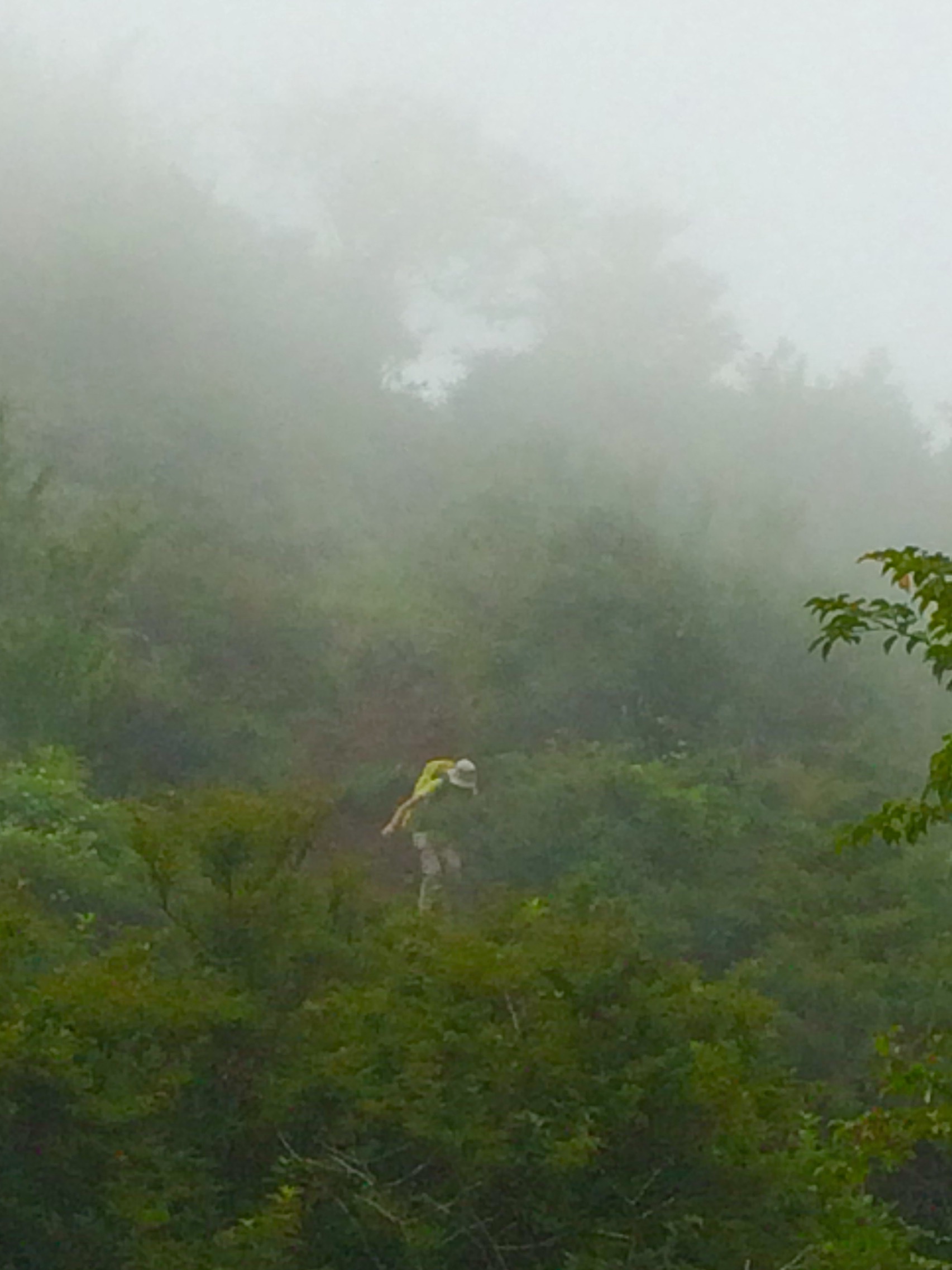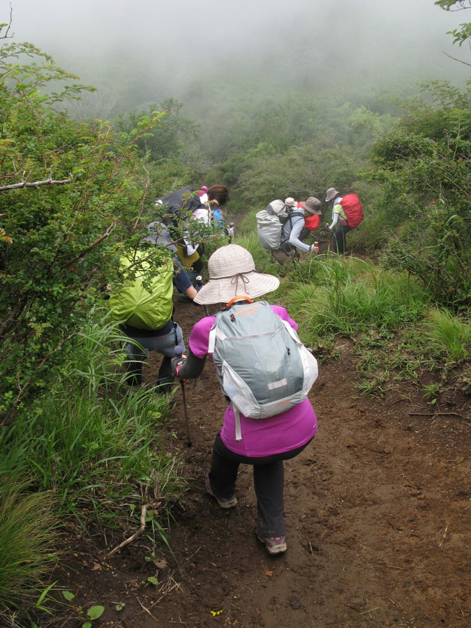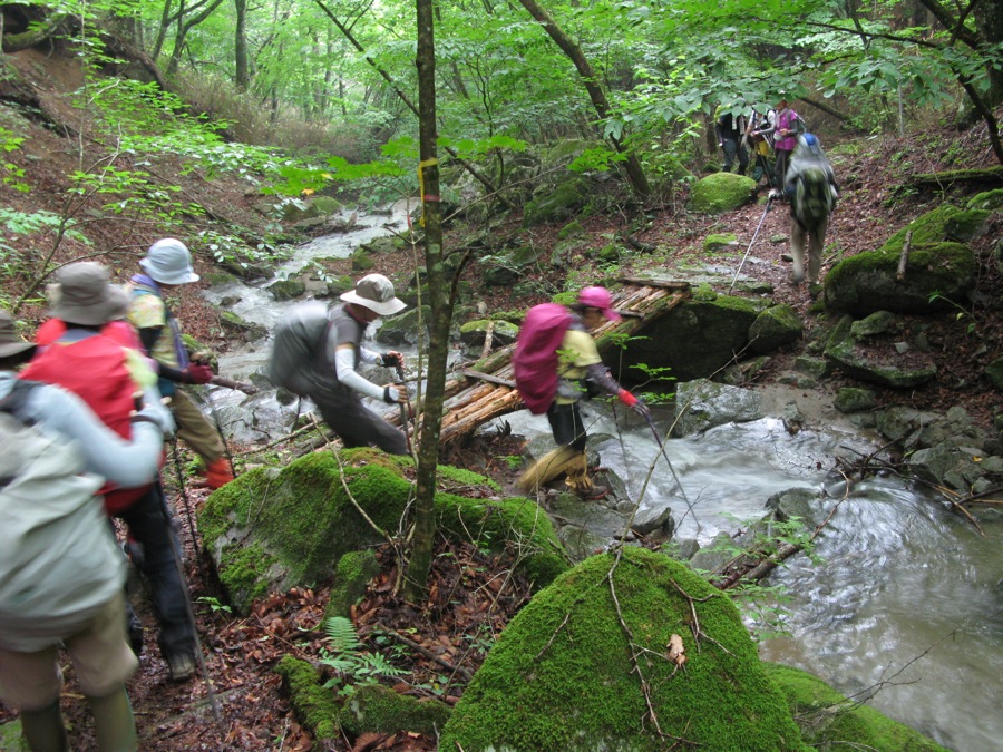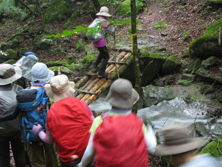 私たちの登山ルートの中で、濡れた木の橋が一番危険な存在だと考えています。ですからみなさん「耳タコ」状態だとは思いますが、木の滑り具合を確かめることと、必ず二種類のものに靴底を乗せる(接地ポイントを1点にしない)ことを繰り返し注意しています。滑ると大けがをする状況だからです。したがっていま渡っている人は怖がっているのではなくて100%の安全な歩き方をしている、とお考えください。