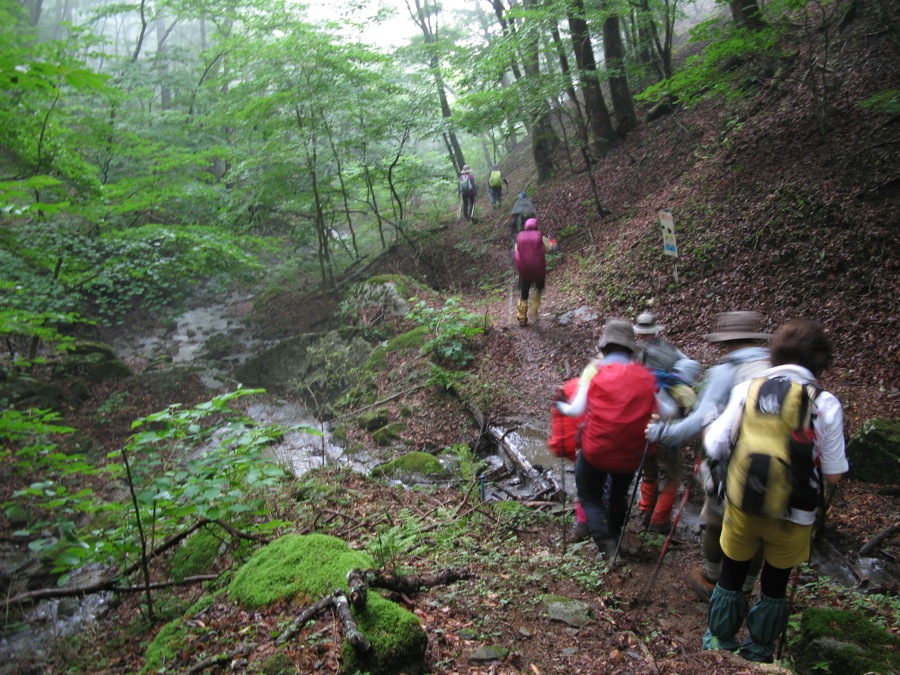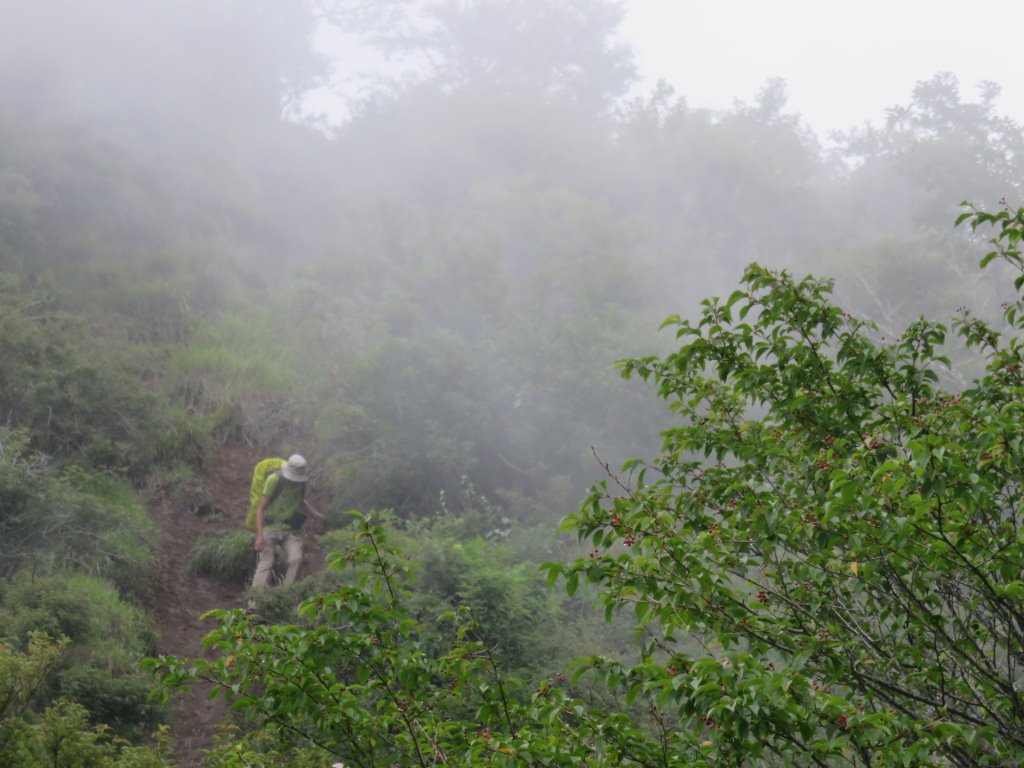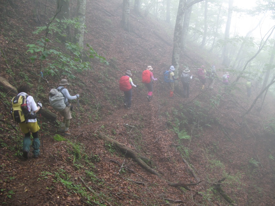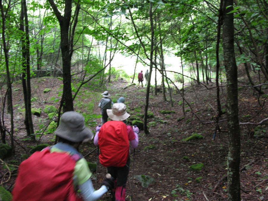 ハマイバ丸から下る道に一か所急坂があります。濡れているとやっかいなところです。糸の会は全員ダブルストックを持っているので、登りはふつうのシニア登山者でも、下りになると一般的には上級と目されるレベルです。このとき私はストックを使っていなかったので下で待つ人の目には恐ろしくたどたどしく見えたにちがいありません。転ぶのも覚悟で、テレマークポジションで下れば良かったと内心反省しました。