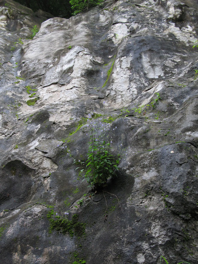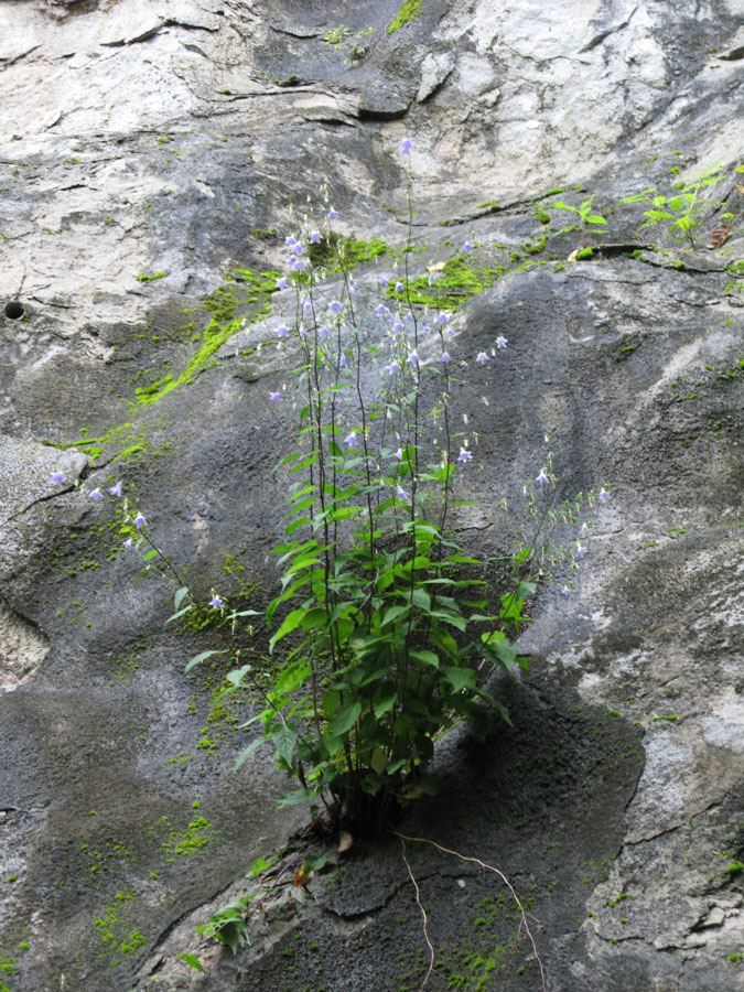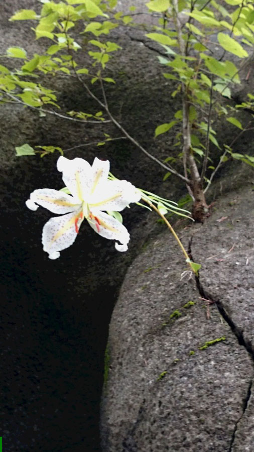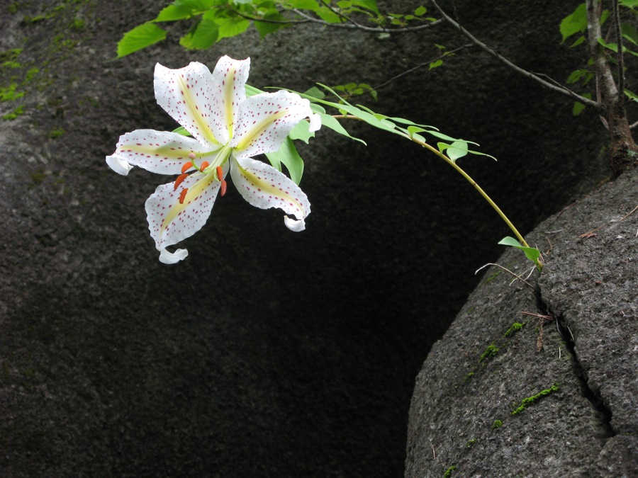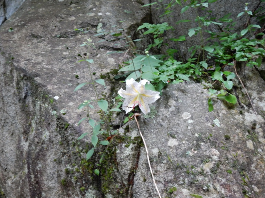 大きな岩の割れ目から、大きな山ユリの一輪がガンバってます。
