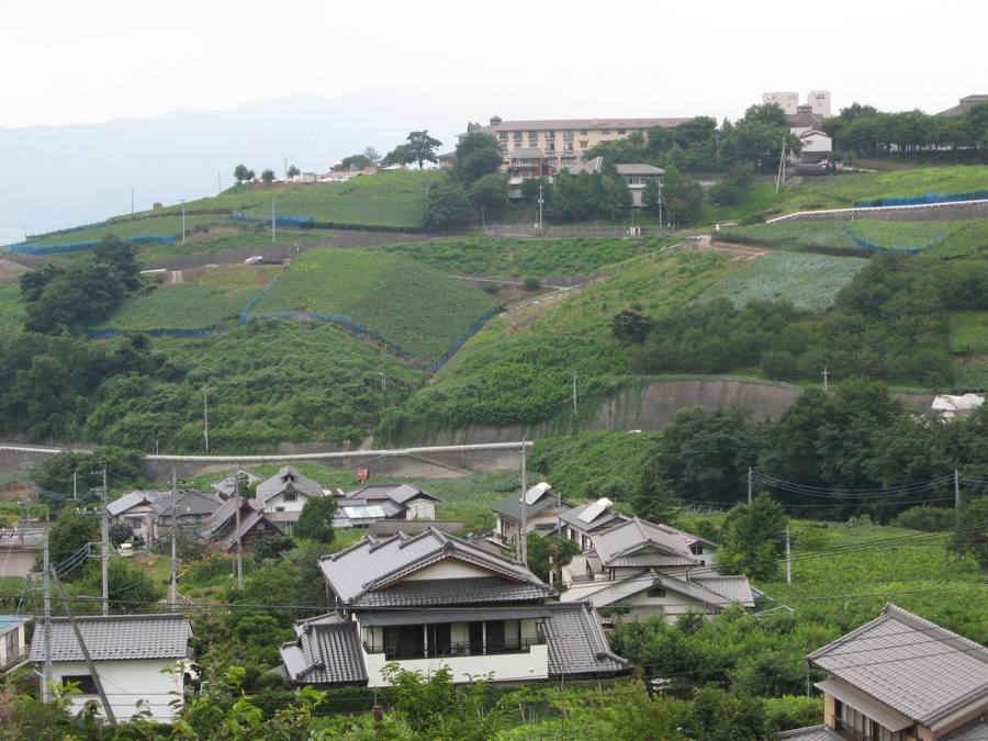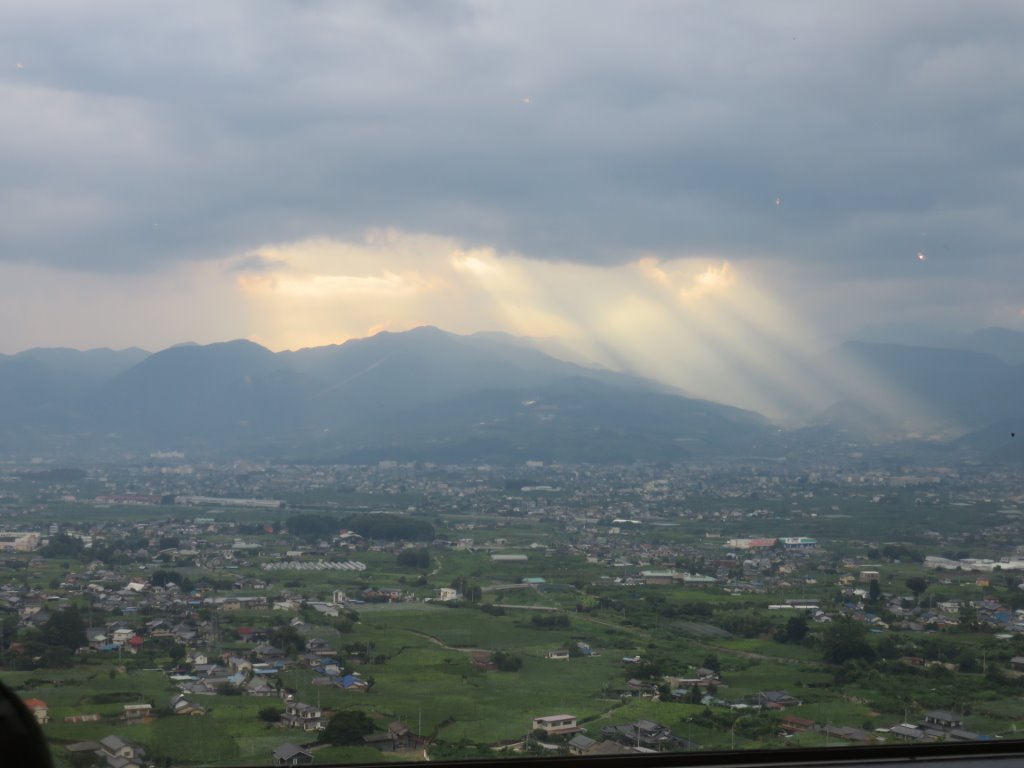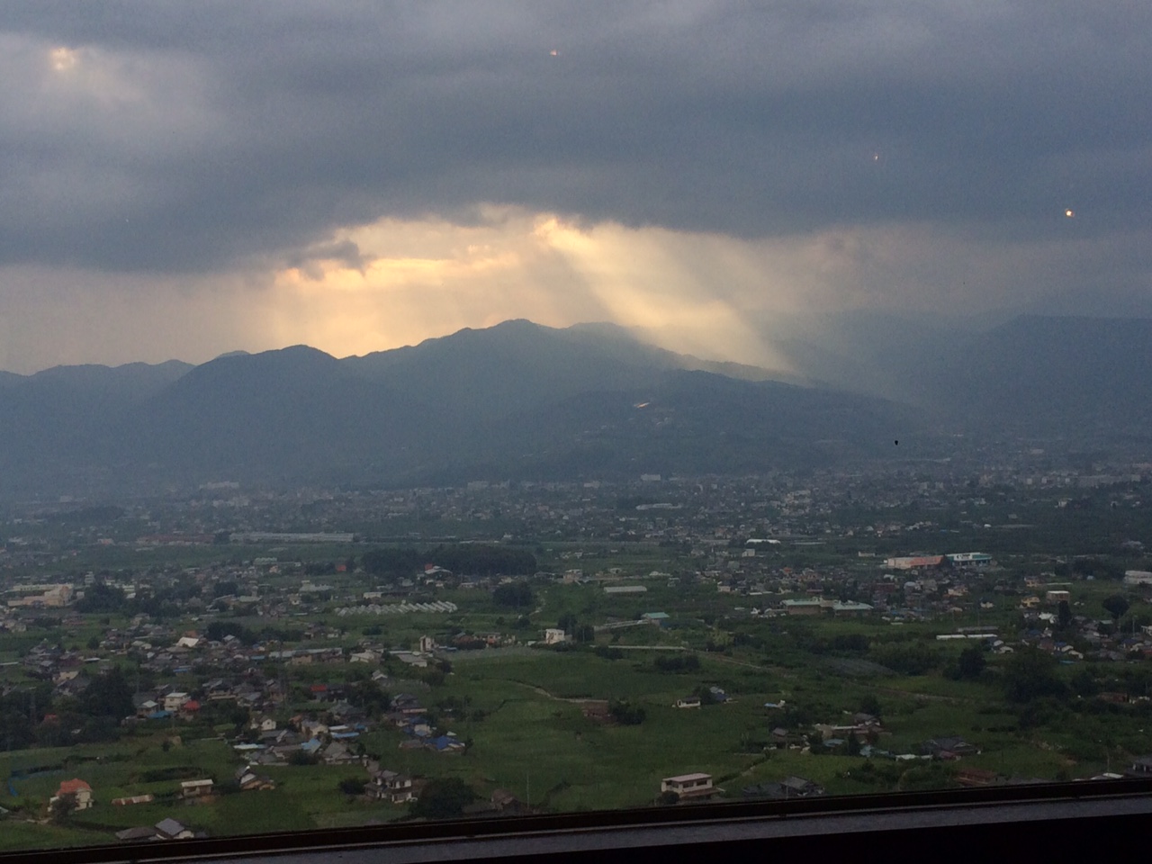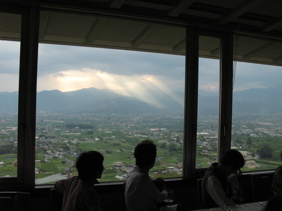 天空の湯で入浴の後、ワインレストランで食事。日矢の下にある丘には大温室を備えた笛吹川フルーツ公園があり、隣接してフルーツパーク富士屋ホテル、日帰り温泉施設・ぷくぷく温泉も。さらにその上にはほったらかし温泉という具合。麓に広がる田園風景はブドウ、モモ、サクランボなど日本有数の果物産地。
