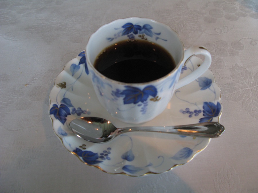 勝沼産ワインの宣伝も兼ねた施設なので地下に試飲のできるカーヴもあり、宿泊棟はなかなかの人気とか。コーヒーカップももちろん葡萄柄。