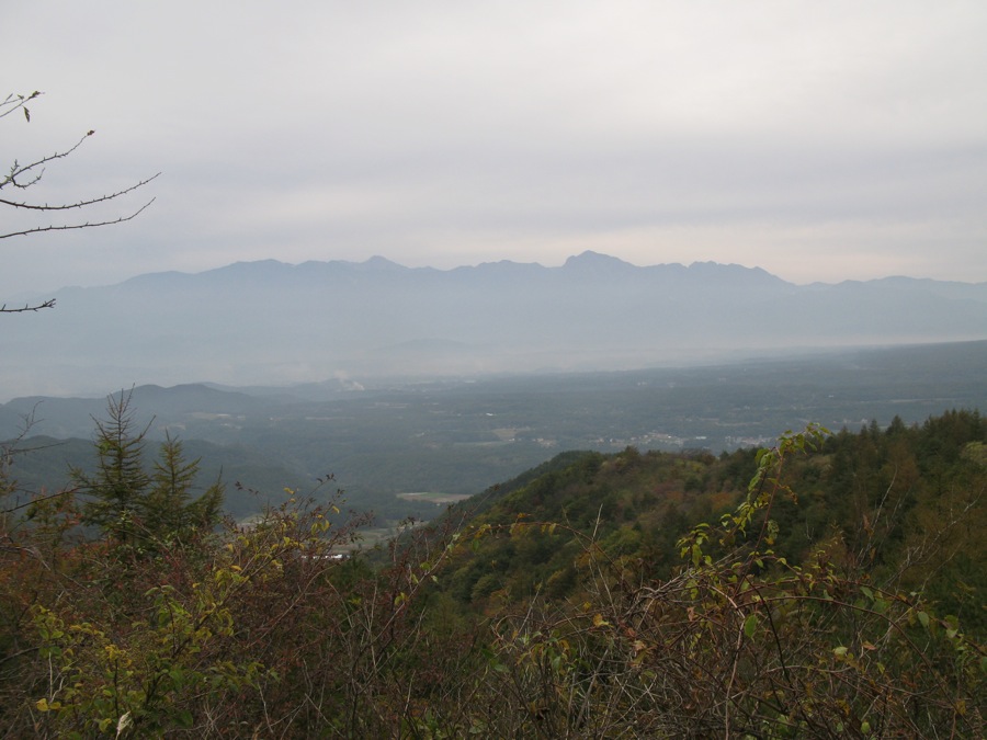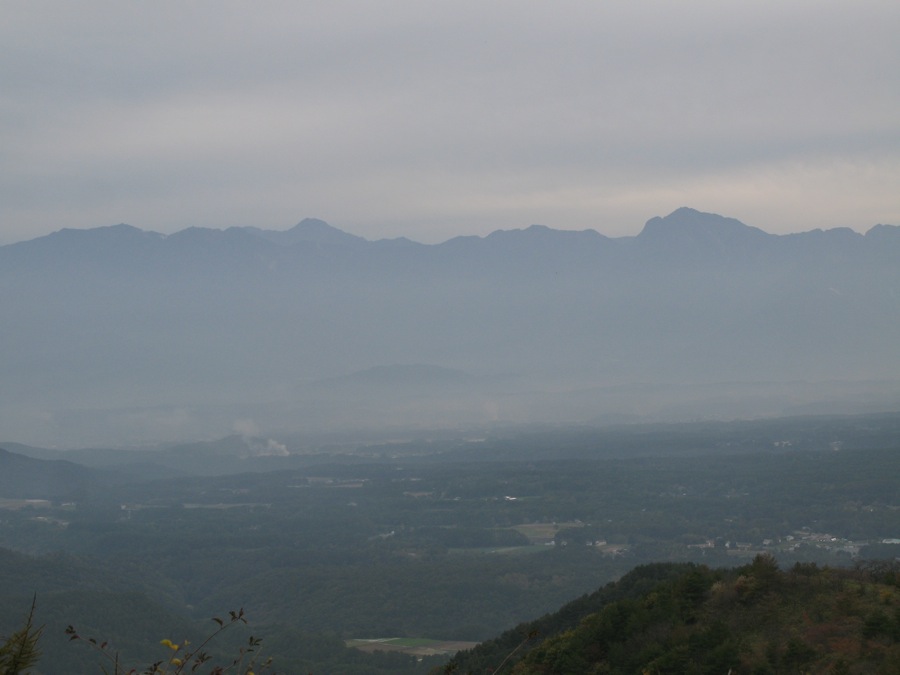ここから見える南アルプスの主役は右側にある甲斐・駒ヶ岳。左肩に魔利支天が張り付いています。もうひとつは左三分の一あたりに見える△型の山。日本第2の高峰、北岳です。その左(じつは手前側の山並みになるのですが)に延びるのは鳳凰三山。肉眼では地蔵岳の岩峰・オベリスクが見えていました。
