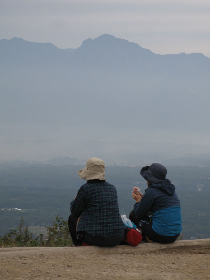 頂上下の広場はすばらしい展望台になっています。このおふたりの頭の上に甲斐・駒ヶ岳が見えています。どうです? この気分。