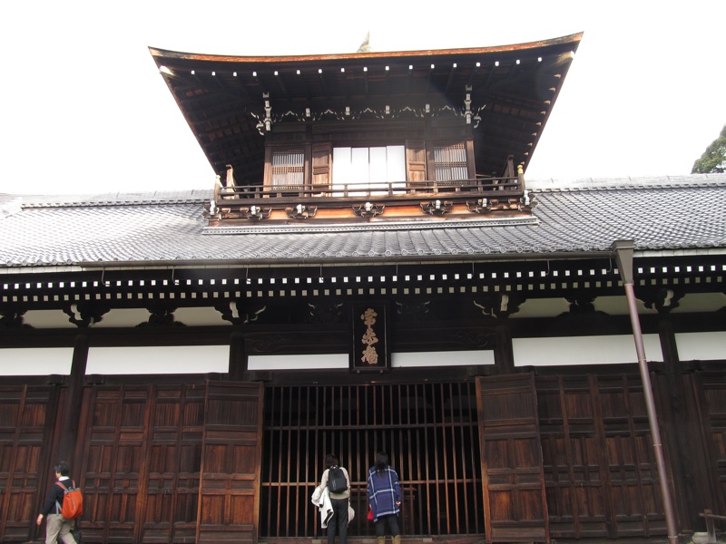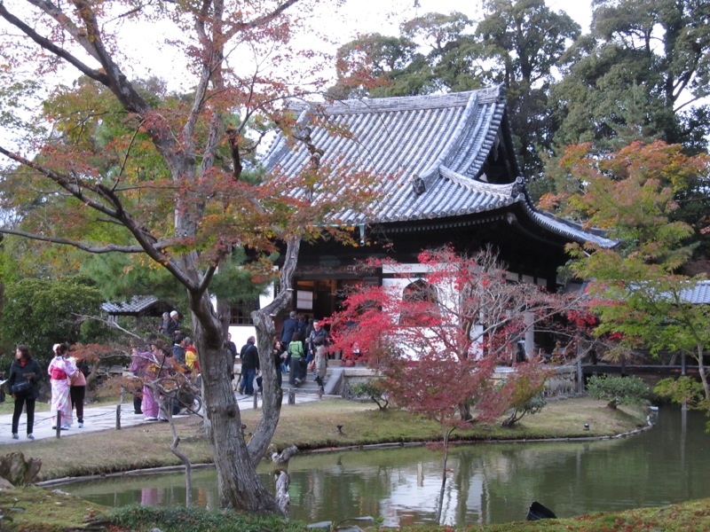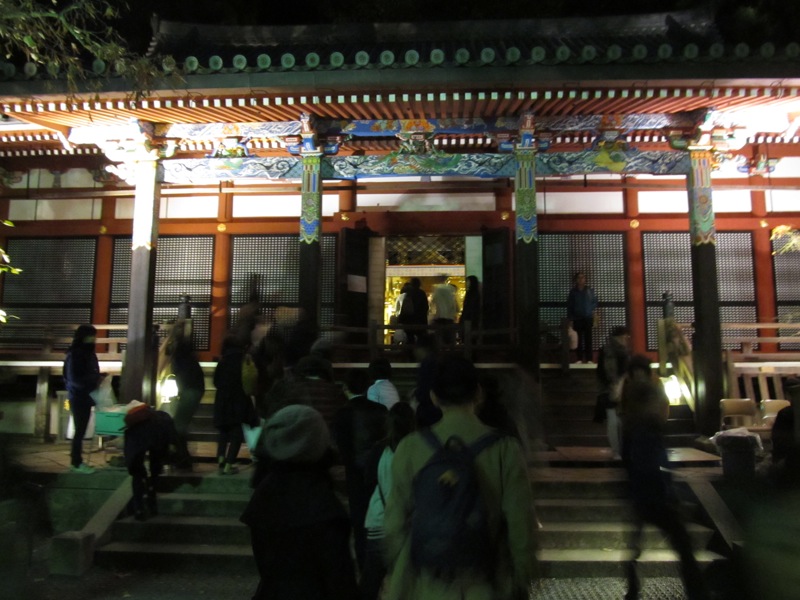 中門から開山堂へと入る人たち。ここでは日没からライトアップということらしいので、夜の部に参加する人たちのようです。広がる水面は臥龍池(がりゅうち)で奥に見える渡り廊下が臥龍廊……だと思います。