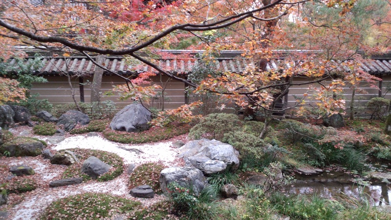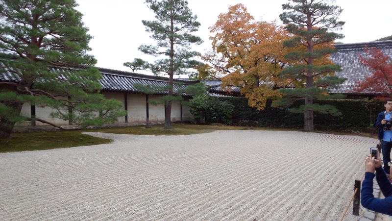 JRで嵯峨駅から二条駅へ、地下鉄で三条→祇園四条へ。八坂神社から円山公園を抜けて高台寺に入りました。といっても、どこから入ってどう抜けたのか私には定かではありません。たぶんこれは方丈前庭、向こうに見えるのが勅使門。この庭を縁先から眺める人がたくさんいて、そのときにはその理由がわからなかったのですが、ライトアップを待つ人たちとか。もうすぐ、ここで何かが起こるわけですね。