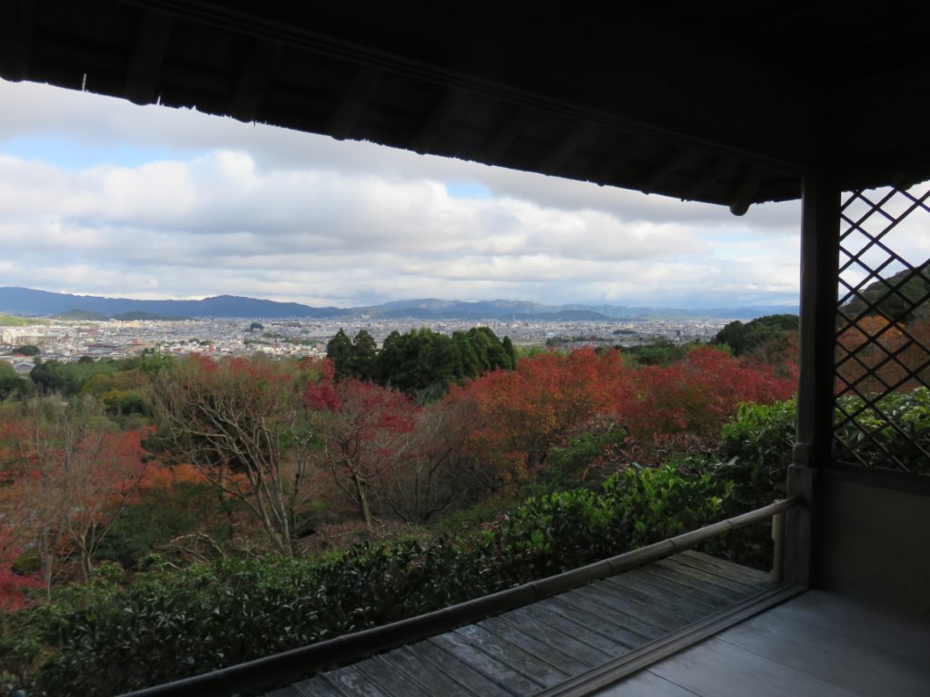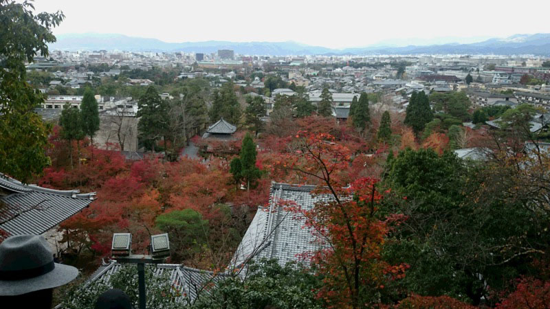 清水の舞台から下を見ています。正面に見える三重塔は子安塔。明治の終わりまで仁王門のそばに立っていたものを移築したのだそうです。