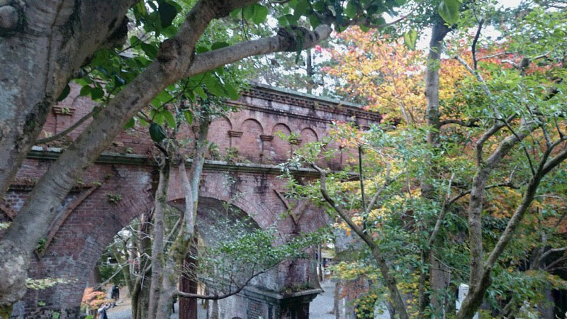 じつは知らなかったので東福寺の境内で右往左往してしまったのですが、境内を出れば簡単。東福寺駅に向かう道筋に臥雲橋がありました。駅から歩いてくればこの場所を通っていたはずなのです。そこから見た通天橋。手前のもみじはまだ色づいていませんが。