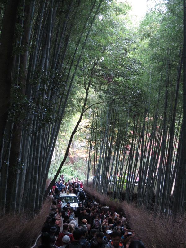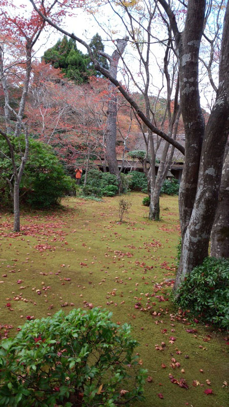 この写真を見て、思い出しました。通天橋に入る前に、赤と緑の絨毯が広がっていました。京都でないとなかなか意識できない晩秋の彩りです。