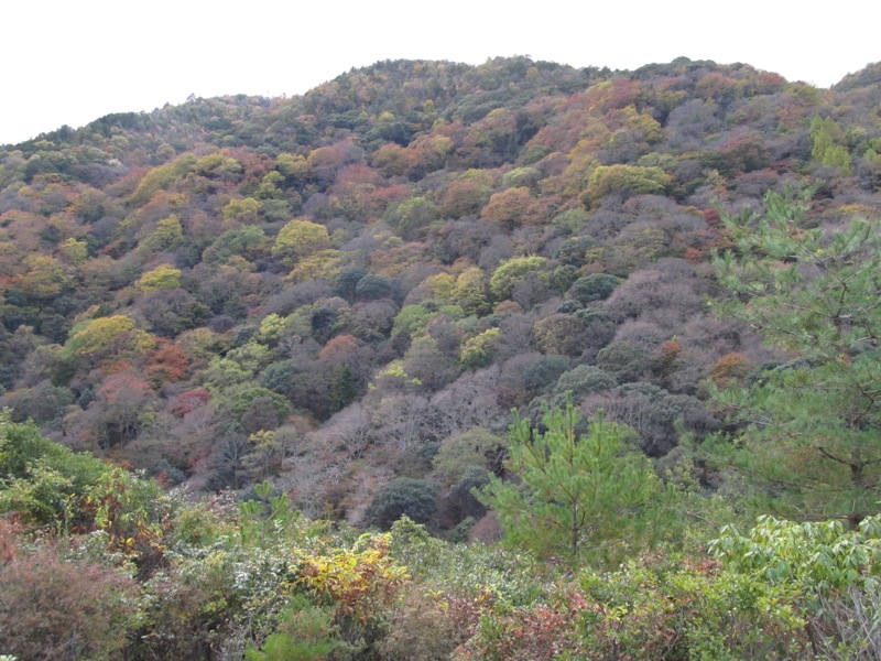 *京都に泊まって京都盆地を歩こうという計画はすでに6月にやりました。大原の温泉民宿に泊まれたので、1日目は大文字山、2日目は比叡山というのがその第一弾。第二弾は紅葉の時期に、箕面を考えました。大阪に宿をとれば、ある程度の人数が直前のルーズな予約(山小屋でいつもやっている方式)で泊まれないはずはないので、関西の紅葉を箕面からスタートしたいと考えました。そして2日目の起点を嵐山にしたのです。その日は6時に道頓堀の宿を出て、東海自然歩道を嵐山から高尾まで歩きました。